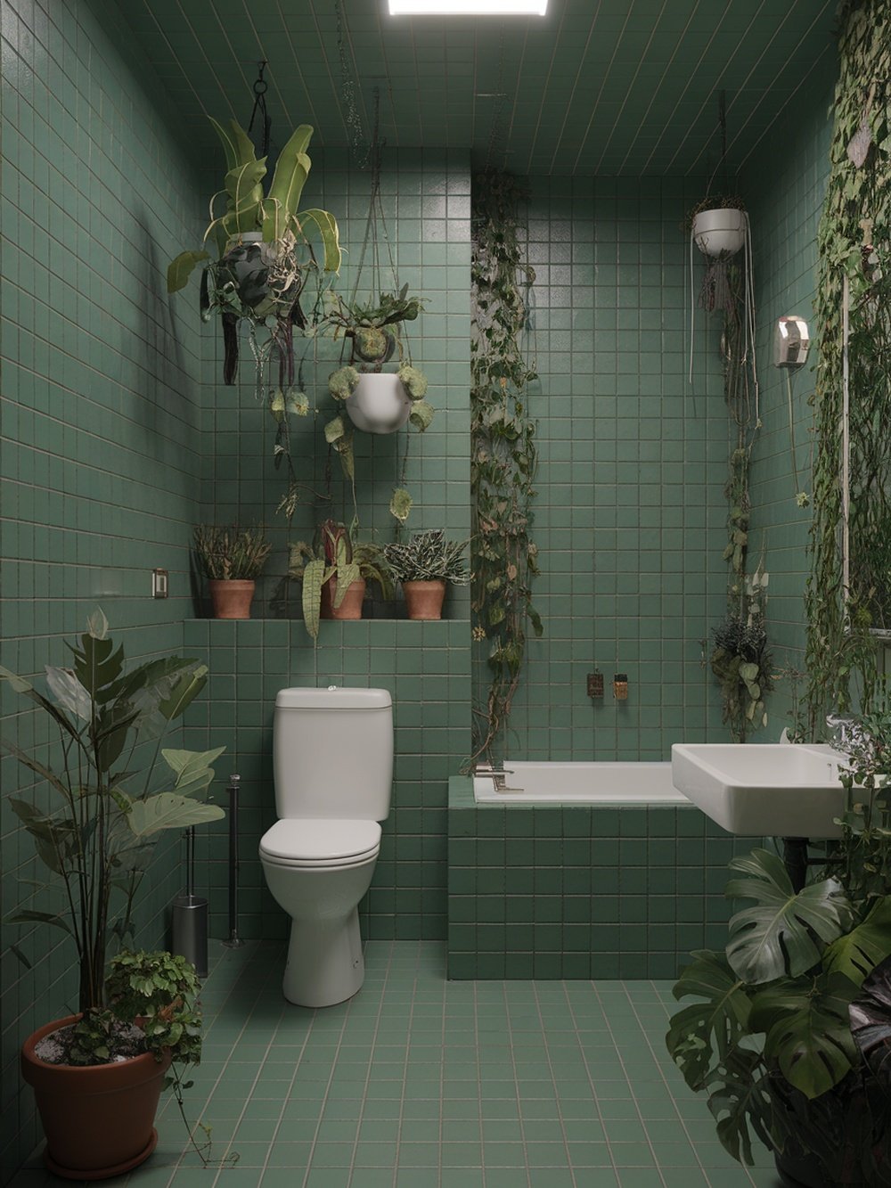 Imagine stepping into a bathroom that feels like a lush retreat. This green botanical oasis captures that feeling perfectly. The walls are adorned with rich green tiles, creating a soothing backdrop that instantly calms the senses. What really makes this space special is the abundance of plants. Ferns and succulents spill over the edges, bringing life and freshness into the room. The greenery not only adds color but also creates a natural atmosphere that feels rejuvenating.