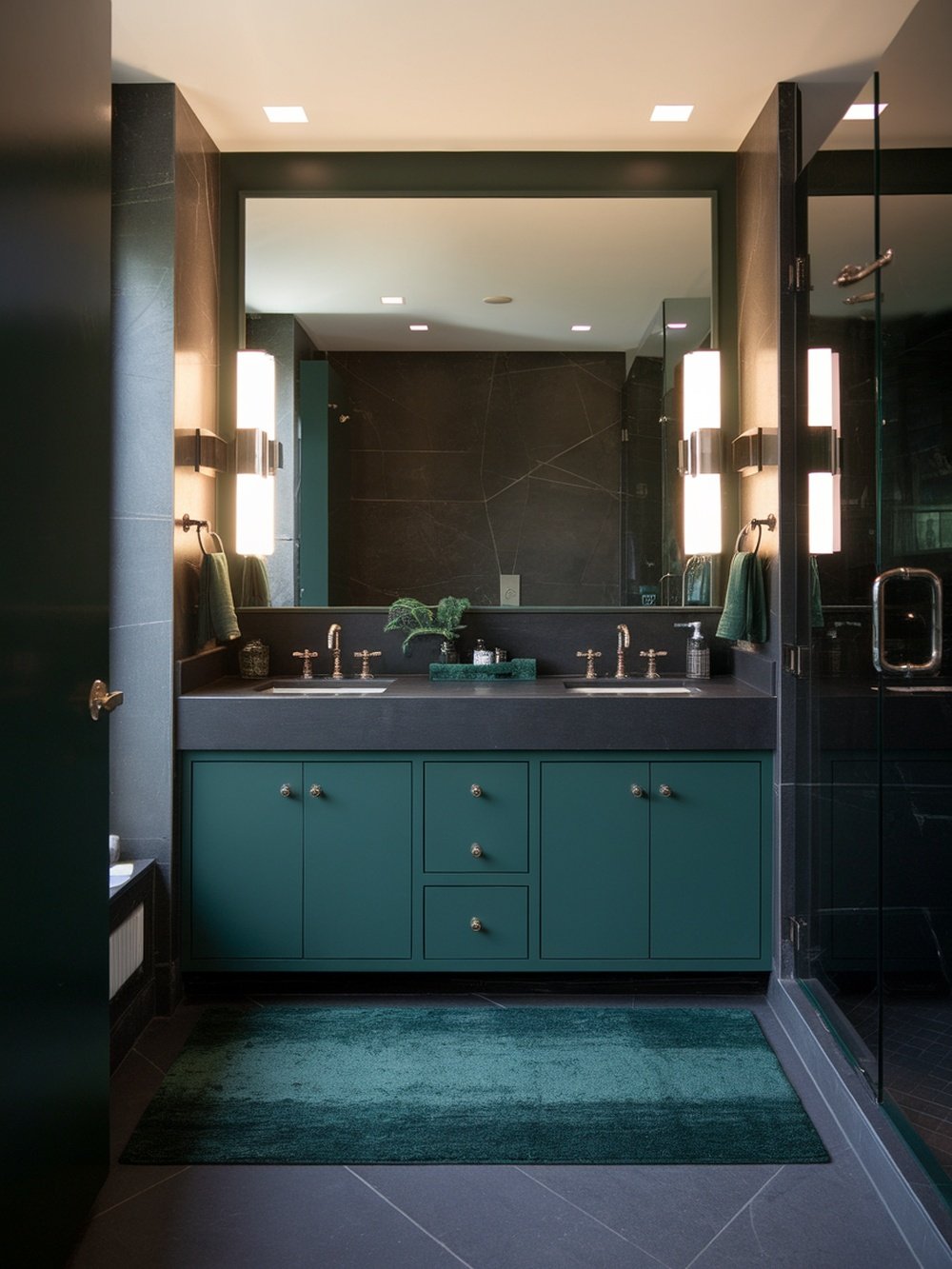 This bathroom design showcases a striking contrast between charcoal and forest green. The dark, charcoal walls create a dramatic backdrop that makes the forest green cabinetry pop. The combination is both bold and inviting. The sleek lines of the cabinetry and the modern fixtures add a touch of sophistication. The green tones bring a refreshing vibe, reminiscent of nature, while the charcoal adds depth and elegance.