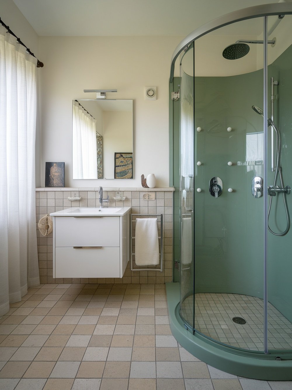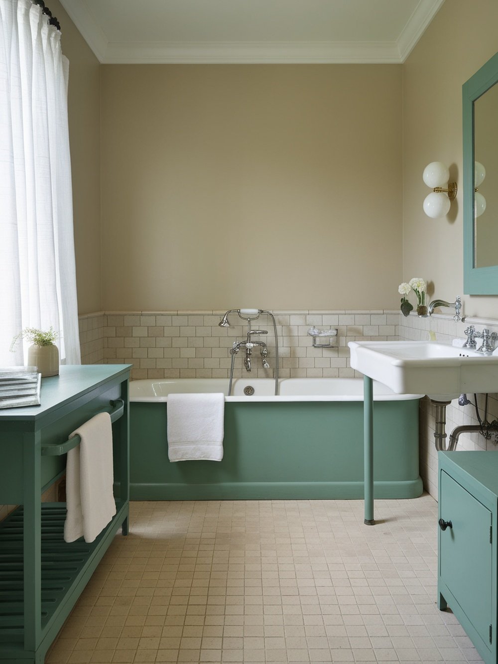 This bathroom showcases a lovely blend of jade green accents against a soft neutral backdrop. The calming hues create a serene atmosphere, perfect for relaxation. The jade green elements, like the bathtub and furniture, pop beautifully against the beige walls and light tile flooring. The simplicity of the design makes it feel spacious and inviting. The white curtains let in natural light, enhancing the overall brightness of the room. The combination of textures, from the smooth tiles to the soft fabrics, adds depth without overwhelming the space.