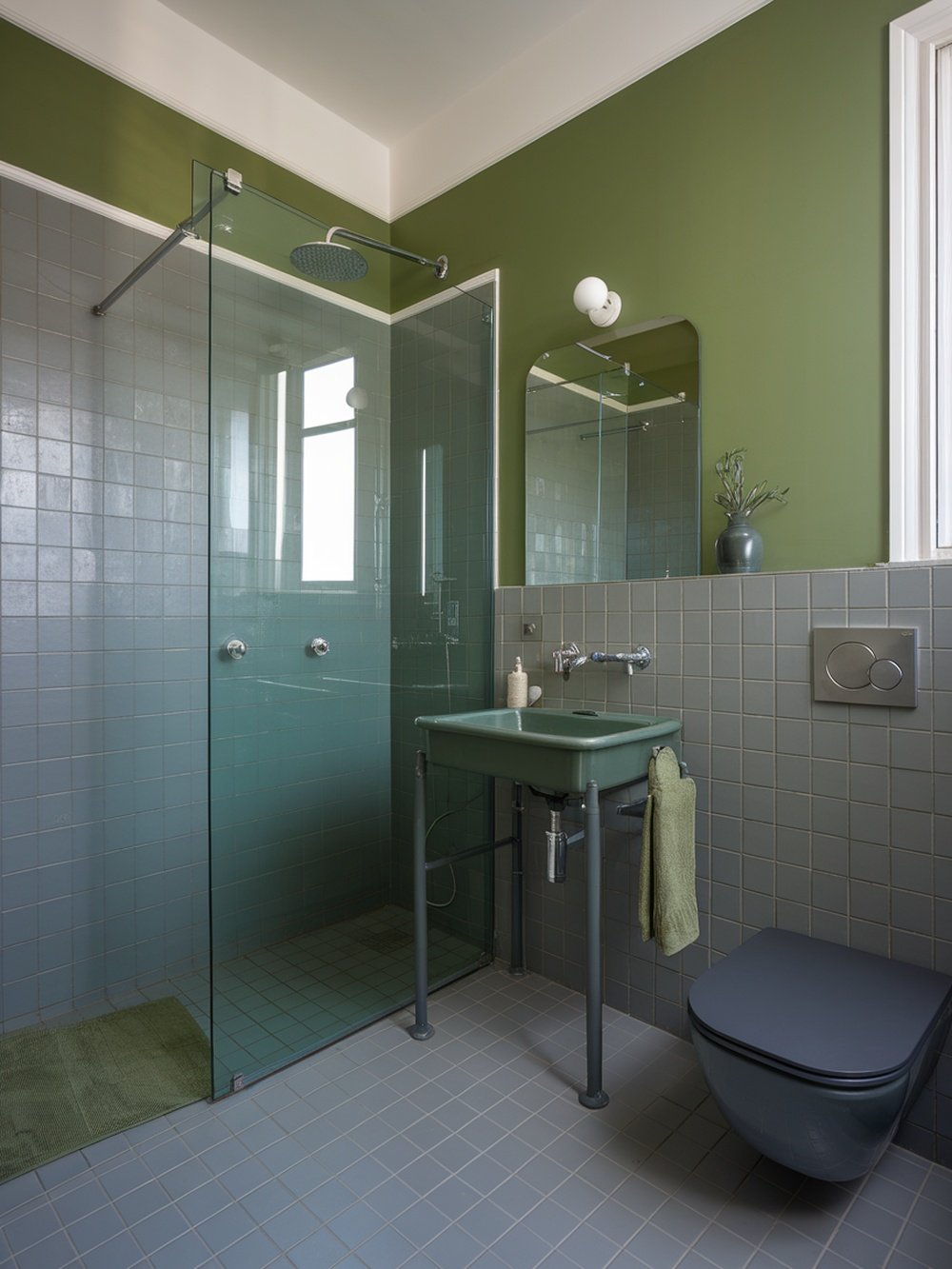 This bathroom showcases a stunning blend of green and gray, creating a fresh and modern look. The deep green walls bring a sense of nature indoors, while the gray tiles provide a sleek contrast. Together, they create a balanced and inviting space. The glass shower adds an open feel, allowing natural light to flow through. The minimalist design of the fixtures keeps the focus on the color scheme, making the room feel spacious and airy. The green sink and towel add subtle pops of color that tie the whole look together.