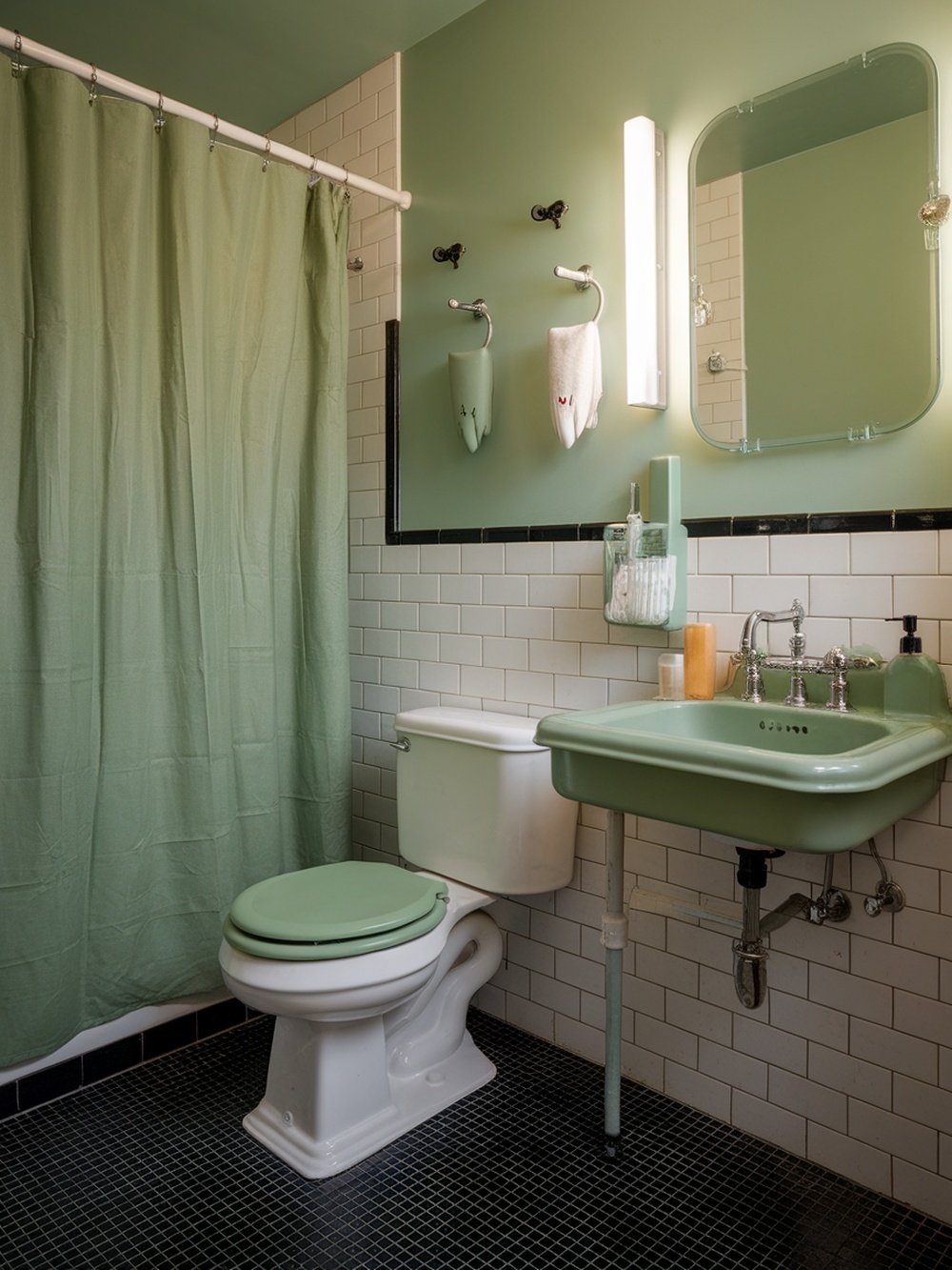Retro green fixtures can bring a unique charm to your bathroom. This image showcases a delightful blend of vintage elements with a fresh green palette. The green toilet seat and sink add a playful touch while maintaining a classic vibe. The soft green shower curtain complements the overall look, creating a cohesive feel. The combination of white tiles and black accents enhances the retro aesthetic, making the space feel both nostalgic and modern.