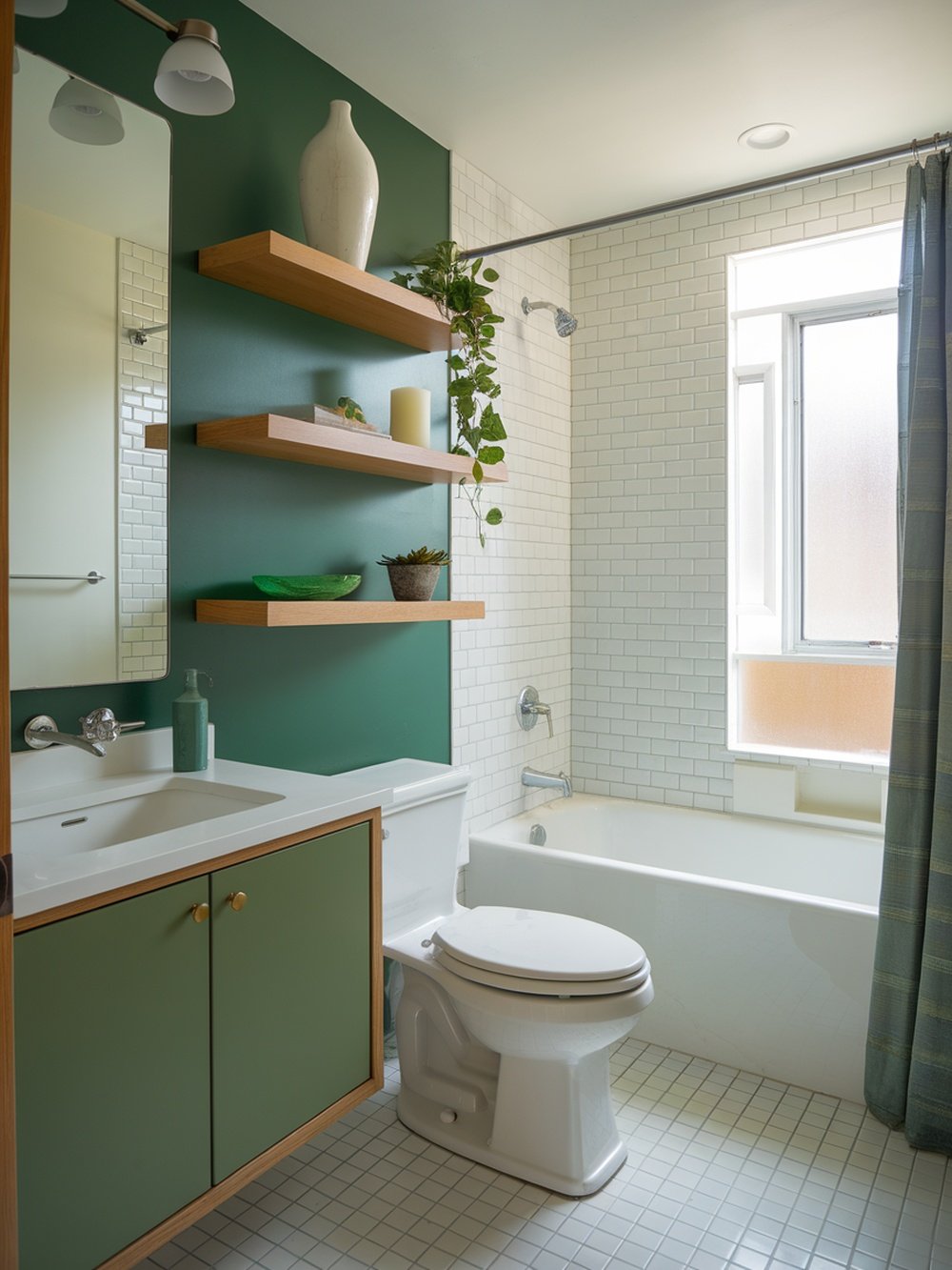 In this stylish bathroom, the green accent wall adds a refreshing touch that instantly catches the eye. The rich color creates a cozy vibe, making the space feel inviting and warm. It’s a perfect backdrop for the floating shelves that showcase decorative items and plants. The floating shelves not only provide storage but also serve as a design element. They break up the wall space and allow for personalization. You can easily change the decor on these shelves to match your mood or the season.