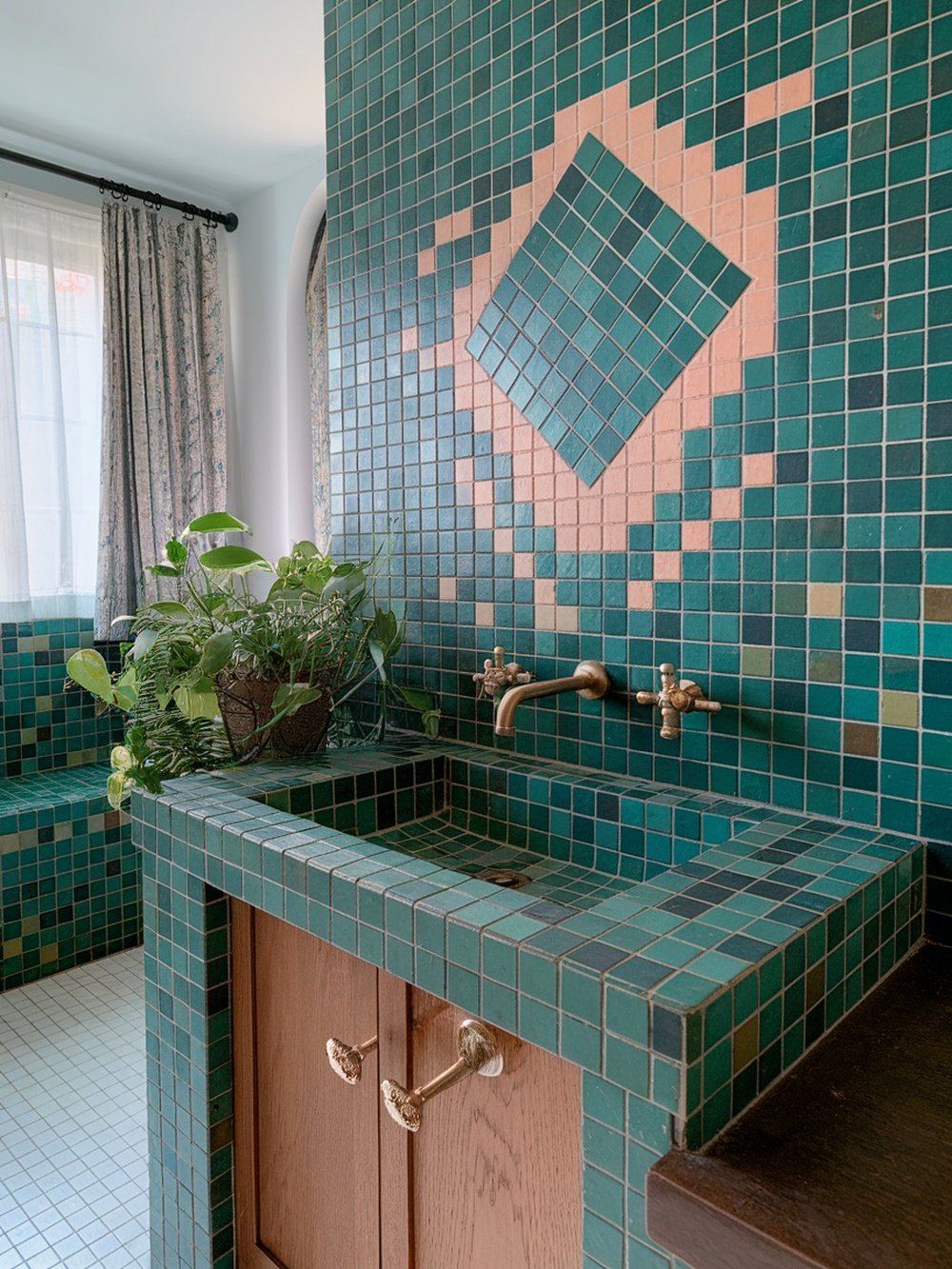 Green mosaic tiles can truly transform a bathroom into a refreshing retreat. This image showcases a stunning arrangement of green tiles that create a lively and inviting atmosphere. The varying shades of green add depth and interest, making the space feel both modern and cozy. The unique diamond pattern adds a playful touch, drawing the eye and creating a focal point. It’s a great way to incorporate color without overwhelming the space. Pairing these tiles with natural elements, like the potted plant seen here, enhances the fresh vibe.