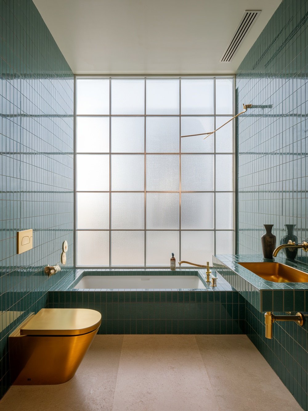 This bathroom design brings a touch of Art Deco flair with its rich green tones and elegant details. The deep green tiles create a bold backdrop, while the gold accents add a hint of luxury. The combination of textures, from the glossy tiles to the patterned wallpaper, creates visual interest and depth.