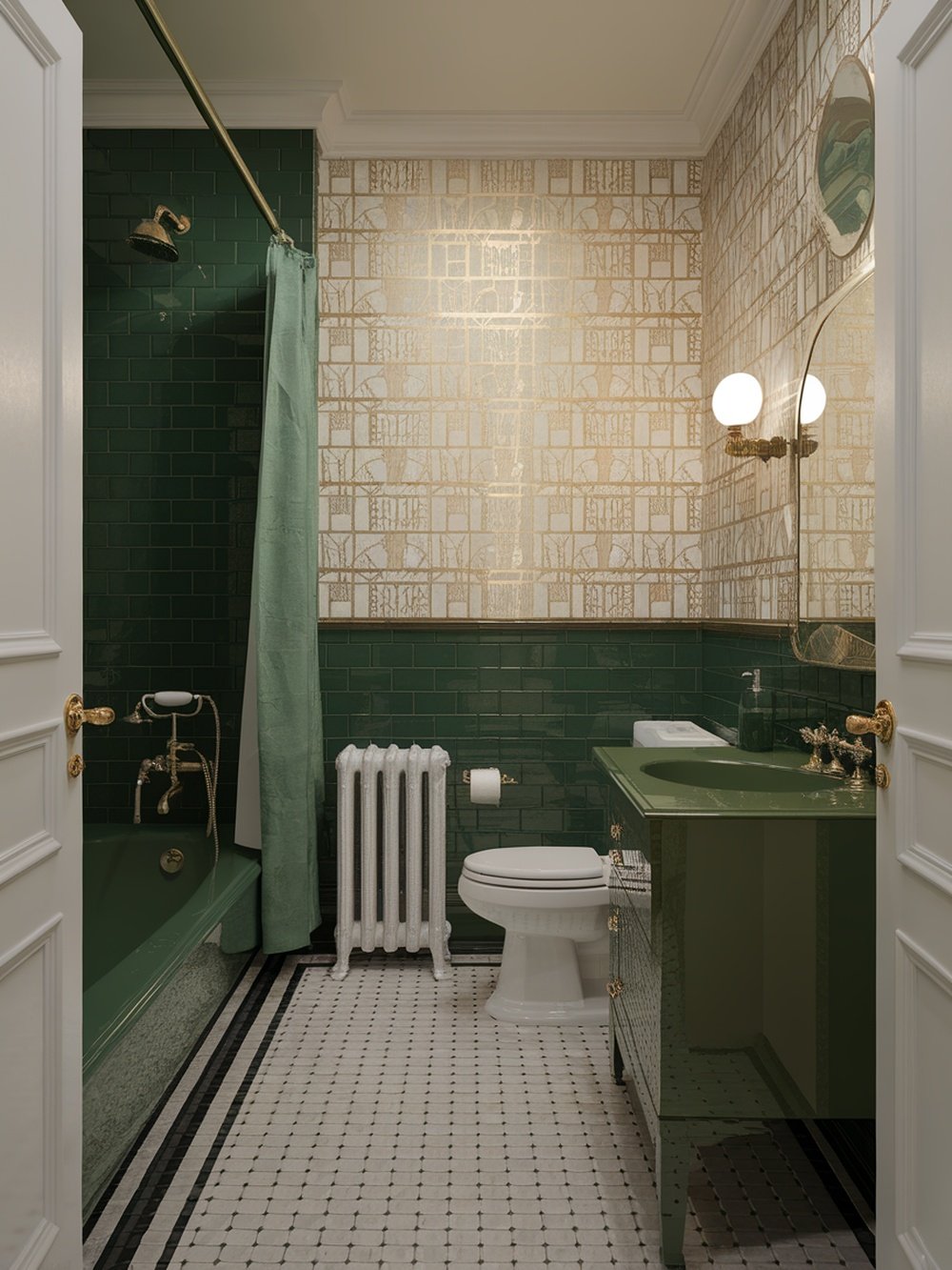 The layout is practical yet stylish, featuring a classic bathtub and a sleek vanity. The round mirror complements the overall design, reflecting light and enhancing the space. The vintage radiator adds a charming touch, blending functionality with aesthetic appeal. This design showcases how green can be both refreshing and glamorous. It’s perfect for anyone looking to update their bathroom with a sophisticated twist. The Art Deco elements make it stand out, turning an everyday space into a stylish retreat.