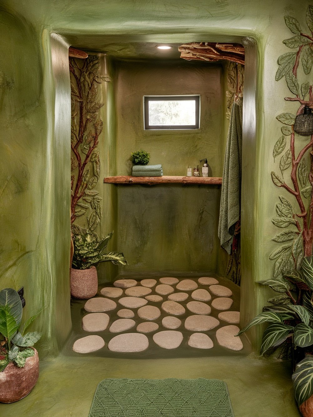 The textured walls, adorned with leaf patterns, add depth and interest. A wooden shelf brings in a natural element, while the stone floor resembles a pebbled path, enhancing the earthy vibe. Potted plants in the corners introduce a splash of life, making the space feel fresh and inviting. With its simple yet striking design, this bathroom is a reminder of how nature can influence our interiors. It’s a great way to refresh your space, bringing in tranquility and style.