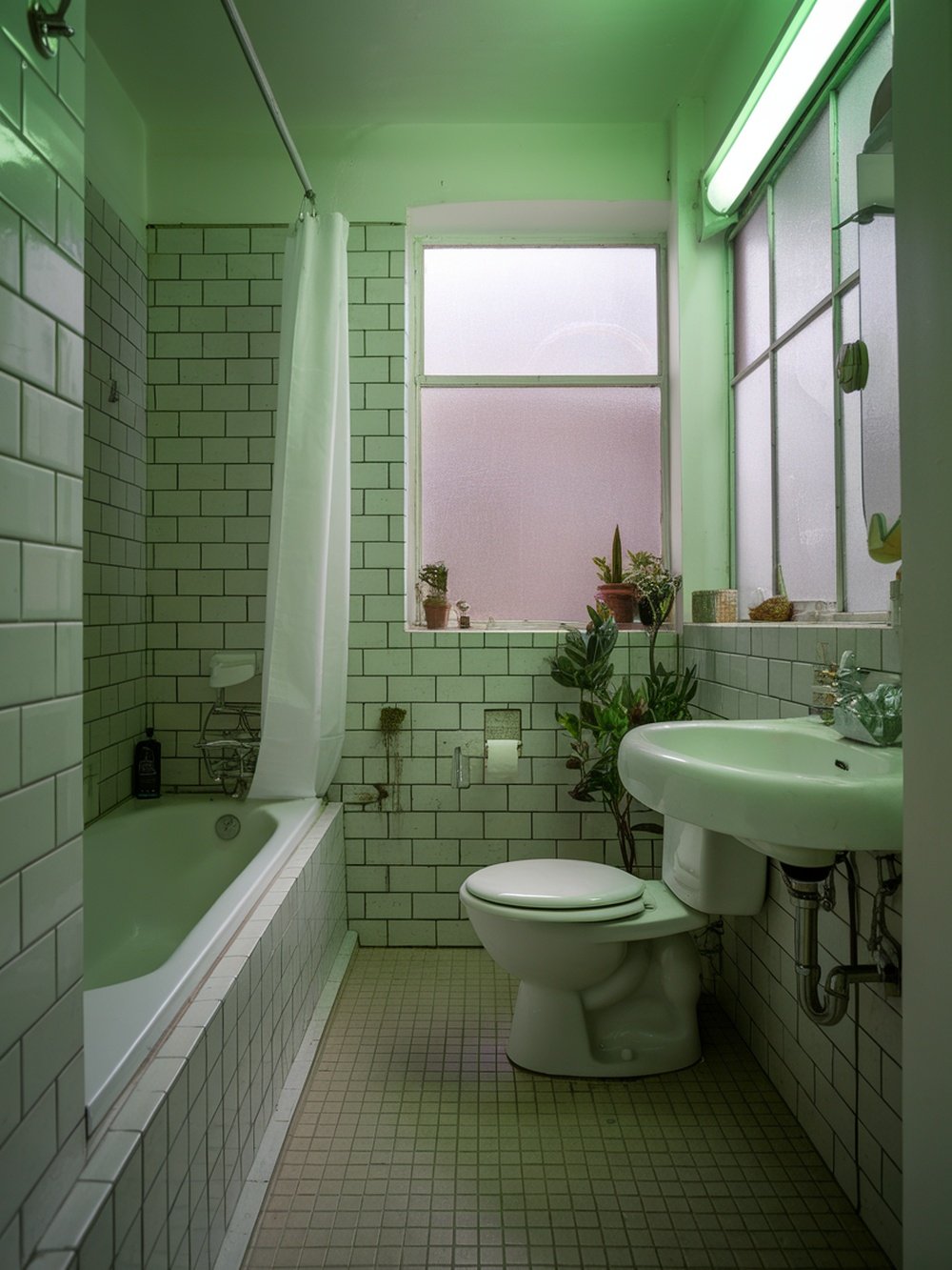 Soft green lighting can transform a bathroom into a serene retreat. The gentle glow creates a calming atmosphere, perfect for unwinding after a long day. In the image, the green light bathes the space, highlighting the clean lines of the tiles and the simplicity of the fixtures. Notice how the light reflects off the white tiles, giving the room a fresh and modern feel. The plants add a touch of nature, enhancing the overall vibe. This combination of elements makes the bathroom inviting and relaxing.