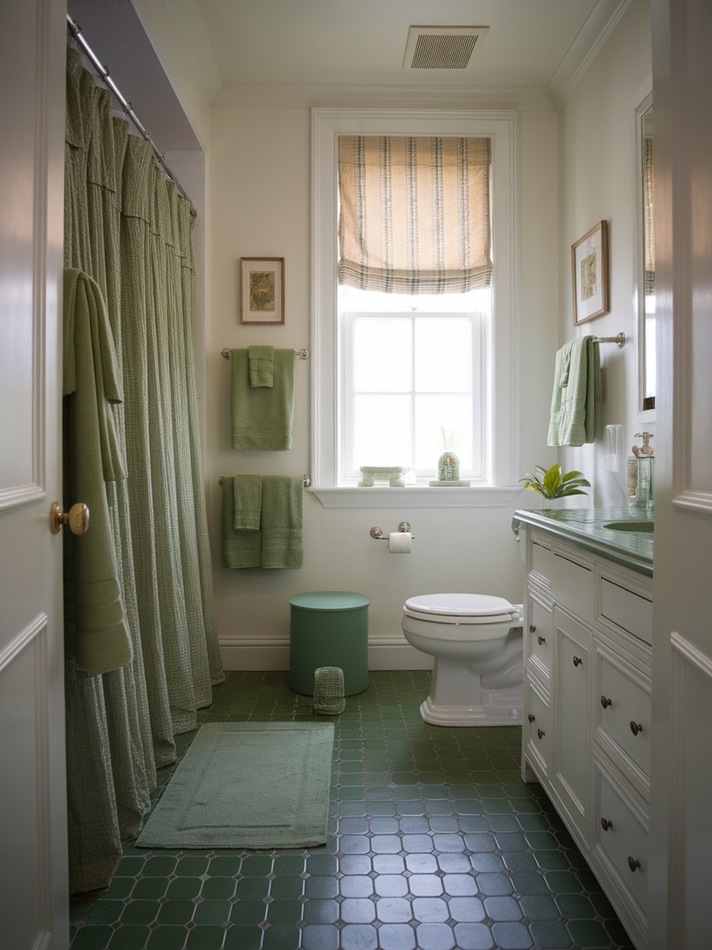 Natural light floods in through the window, highlighting the green tones and making the room feel airy. The striped window treatment adds a bit of contrast, breaking up the solid colors while still keeping the palette in harmony. This combination of elements shows how chic accessories can transform a bathroom into a stylish retreat.