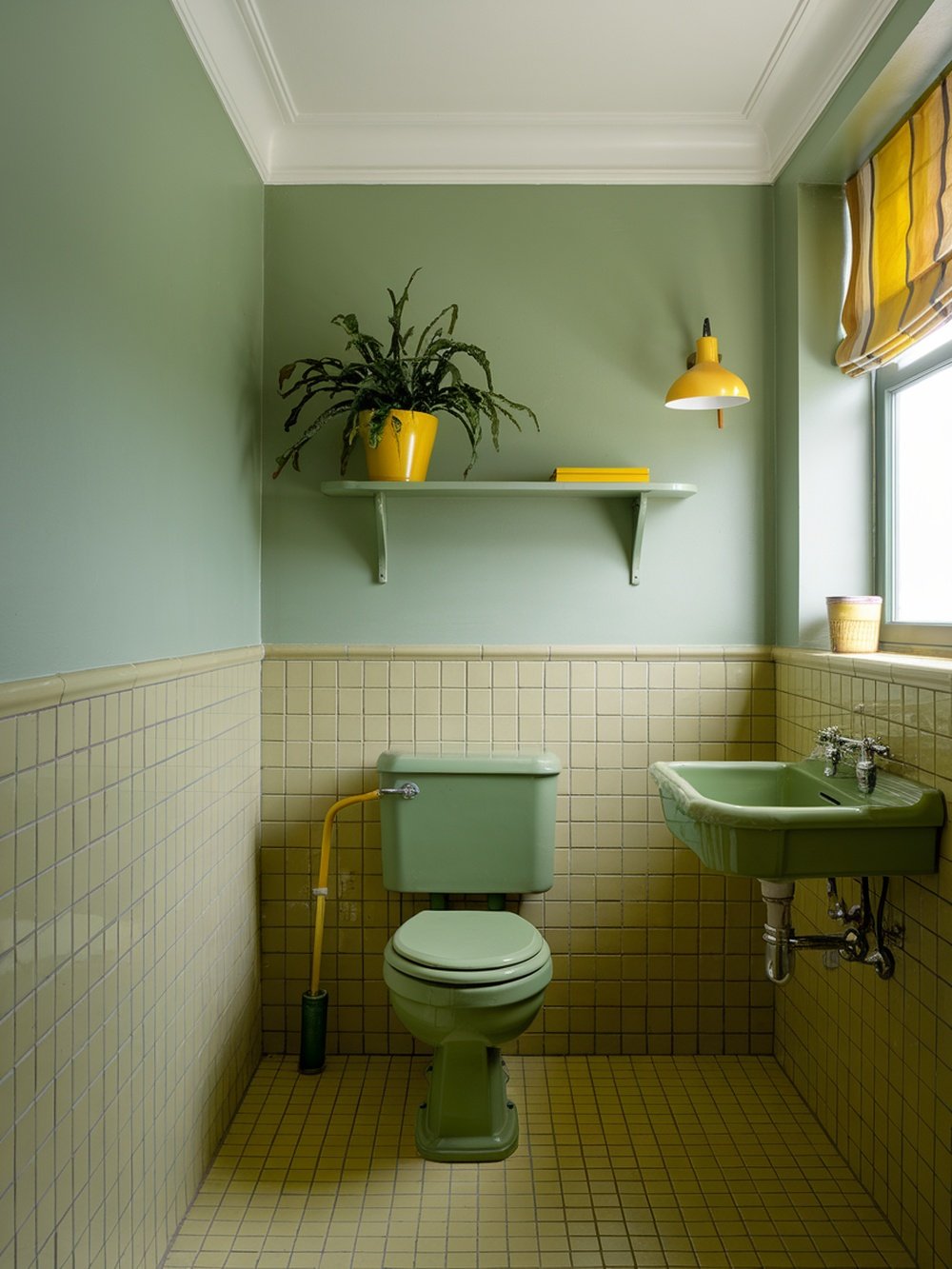 This bathroom showcases a delightful mix of green and yellow, creating a fresh and lively atmosphere. The soft green walls set a calming tone, while the yellow accents add a cheerful touch. A bright yellow plant pot and light fixture draw the eye, making the space feel welcoming. The unique combination of colors is both stylish and functional. The green toilet and sink blend seamlessly with the tiled flooring, enhancing the overall design. The yellow trim on the window adds a playful element, balancing the earthy tones with a pop of brightness.