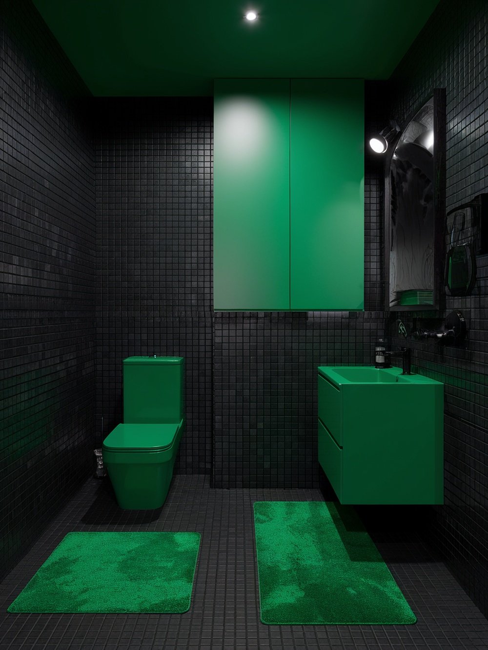 This bathroom design showcases a striking blend of bold green and deep black. The vibrant green fixtures, including the toilet and vanity, pop against the sleek black tiled walls. This combination creates a modern and edgy look that feels fresh and inviting. The green elements are not just functional but also serve as a statement. The matching green bath mats add a touch of comfort while enhancing the overall aesthetic. The black tiles provide a dramatic backdrop, making the green stand out even more.