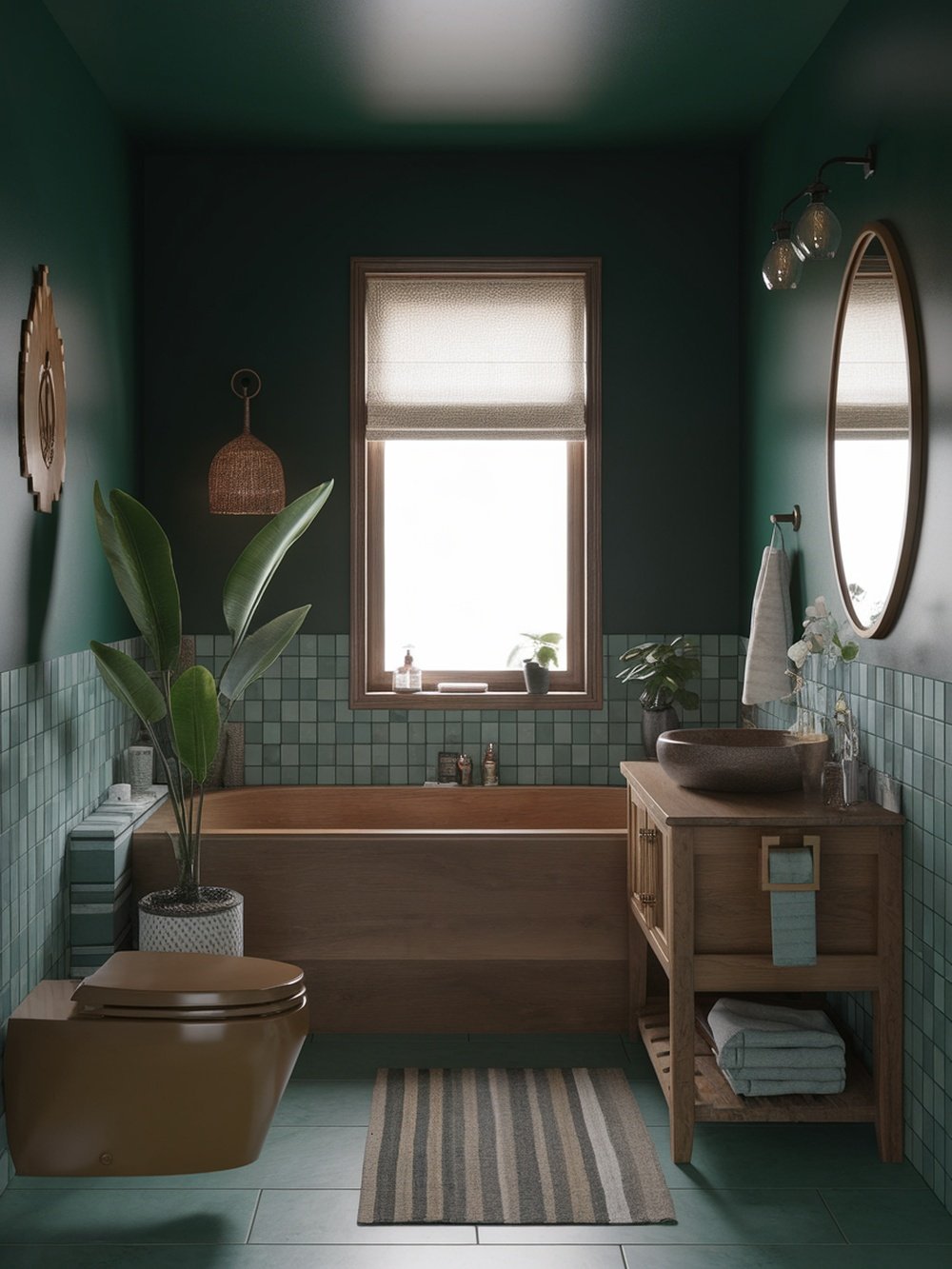 Imagine stepping into a bathroom that feels like a serene spa. The forest green walls wrap you in a cozy embrace, creating a calming atmosphere. This design is perfect for anyone looking to refresh their space with a touch of nature. The wooden accents, like the bathtub and vanity, add warmth and balance to the deep green tones. A large window lets in natural light, brightening the room while keeping it private. The plants bring a bit of the outdoors inside, enhancing the tranquil vibe.