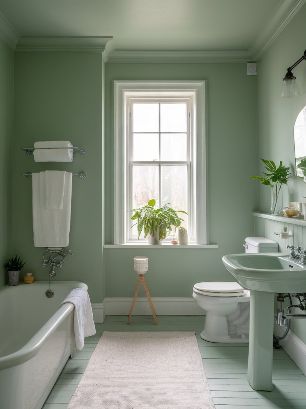 Soft sage green is a color that brings a sense of calm and tranquility to any bathroom. This design showcases a beautiful blend of natural light and soothing hues, creating a refreshing atmosphere. The walls are painted in a gentle sage tone, which pairs perfectly with the natural elements in the space.