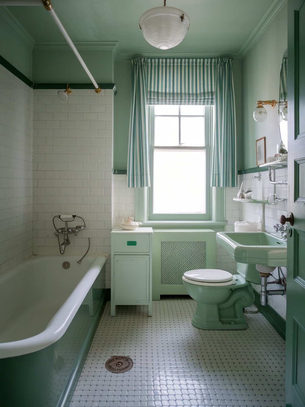 Natural light floods in through the window, making the room feel airy and bright. The striped curtains add a playful touch, complementing the vintage vibe perfectly. With its charming details and soothing color palette, this bathroom is a wonderful example of how mint green can refresh your space while keeping a vintage flair.