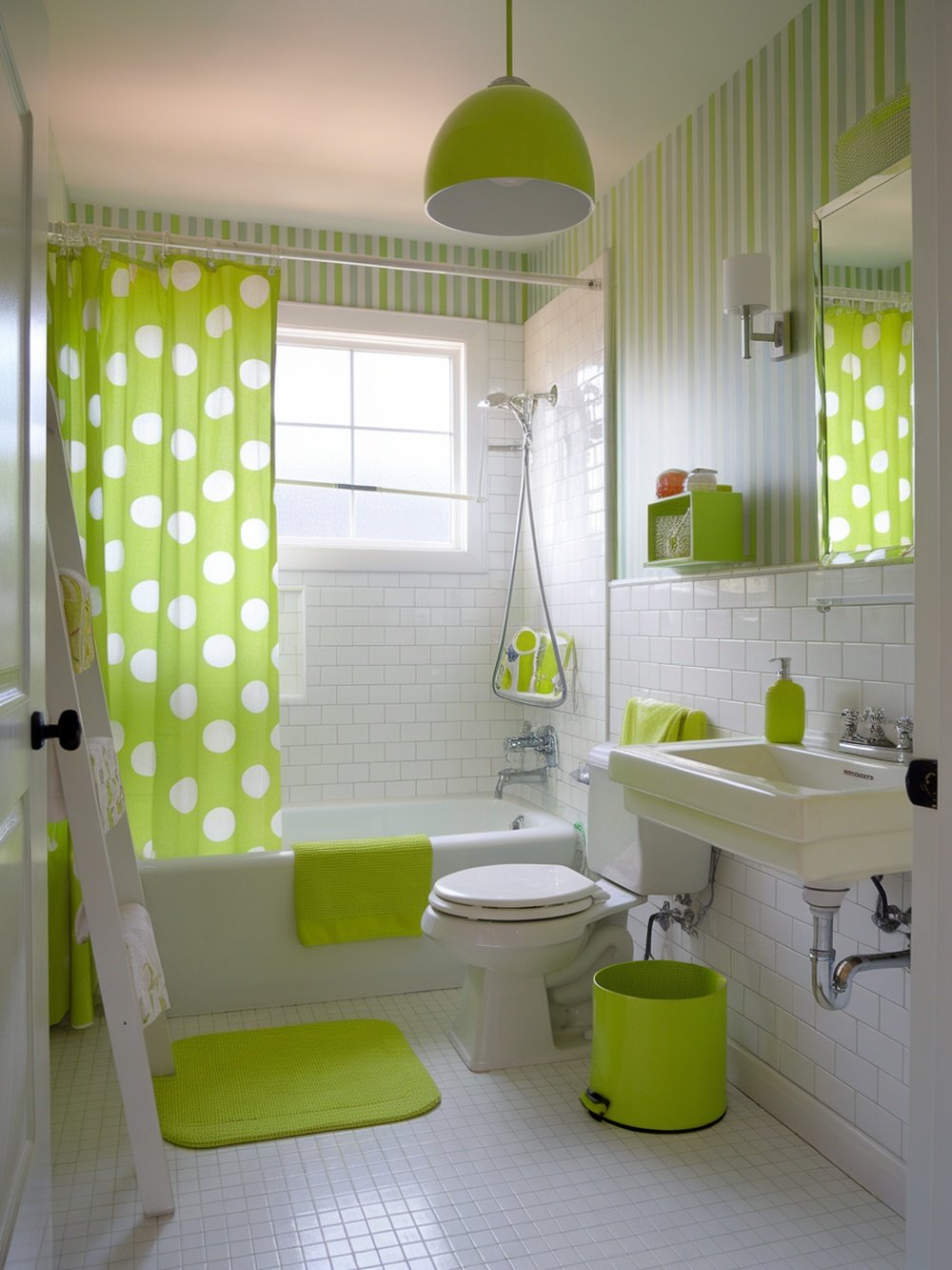 This bathroom design is a fun and lively take on the classic space. The bright lime green color adds a fresh vibe, making it feel inviting and cheerful. The polka dot shower curtain and matching accessories create a playful atmosphere that’s perfect for starting the day on a positive note. The striped wallpaper complements the bold color, adding depth without overwhelming the senses. The white tiles and fixtures provide a clean contrast, ensuring the space feels open and airy. This combination of patterns and colors showcases how a little creativity can transform a bathroom into a stylish retreat.
