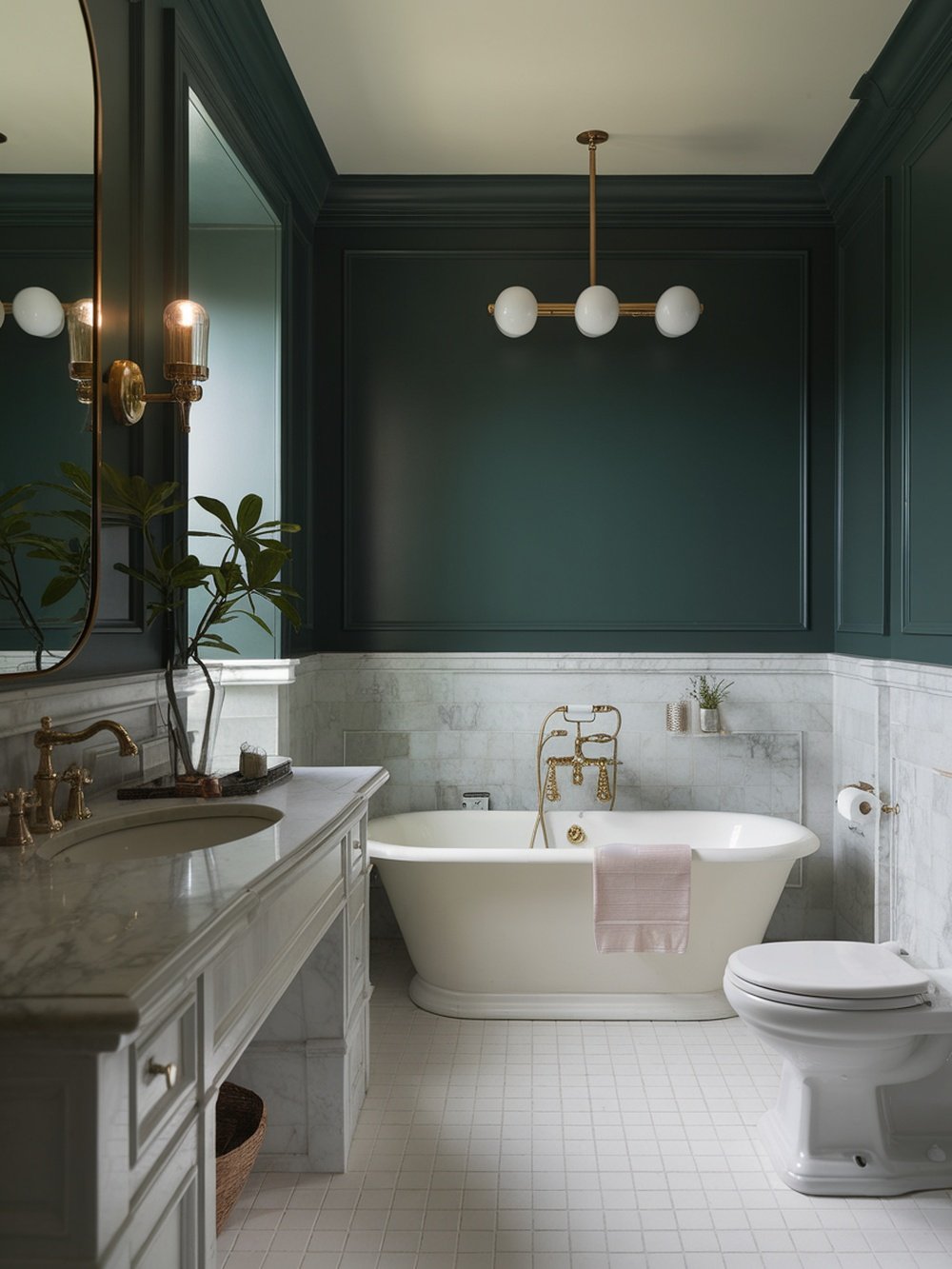 This bathroom design showcases a stunning blend of dark green walls and rich marble accents. The deep green color creates a cozy yet sophisticated atmosphere, making it a perfect retreat for relaxation. The marble elements, particularly around the bathtub and sink, add a touch of luxury and elegance.
