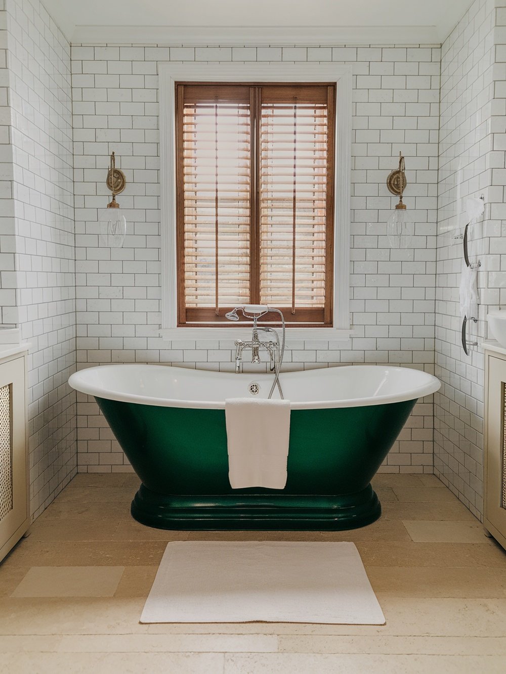 A bottle green bathtub can be a stunning focal point in any bathroom. This deep green color adds a touch of sophistication and elegance, making your space feel more luxurious. The contrast between the green tub and the white tiles creates a fresh and clean look. The classic shape of the bathtub enhances its charm, inviting you to relax and unwind. Pair it with simple accessories, like a soft white towel draped over the side, to keep the focus on the tub itself. The natural light streaming in from the window adds warmth, making the space feel inviting.