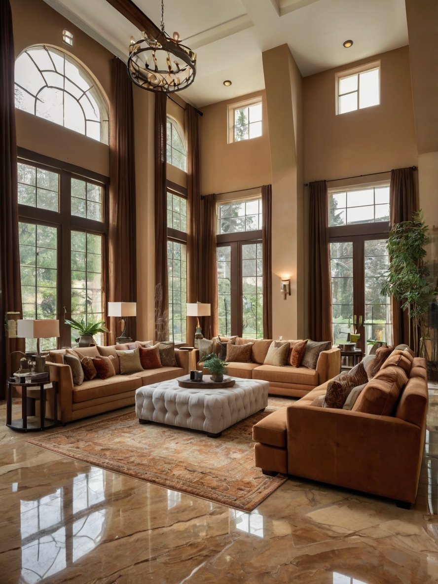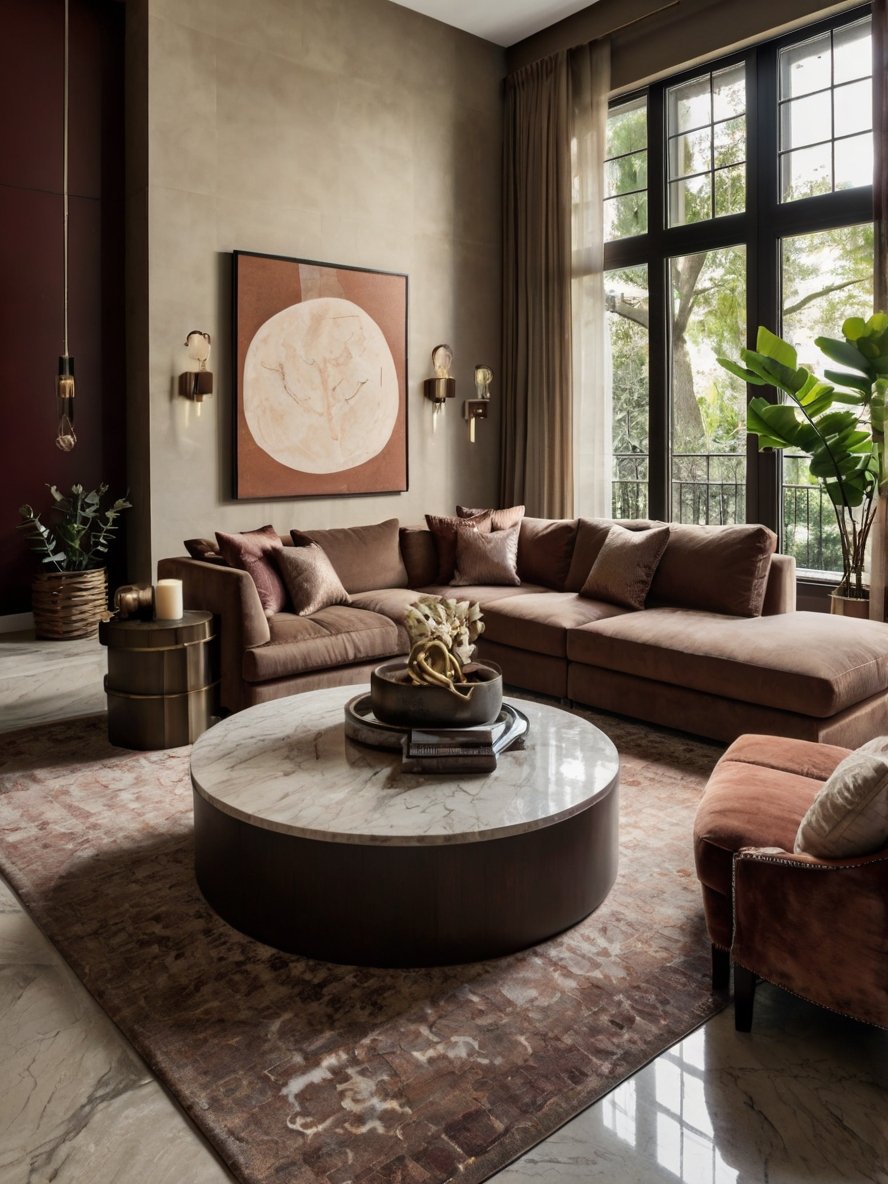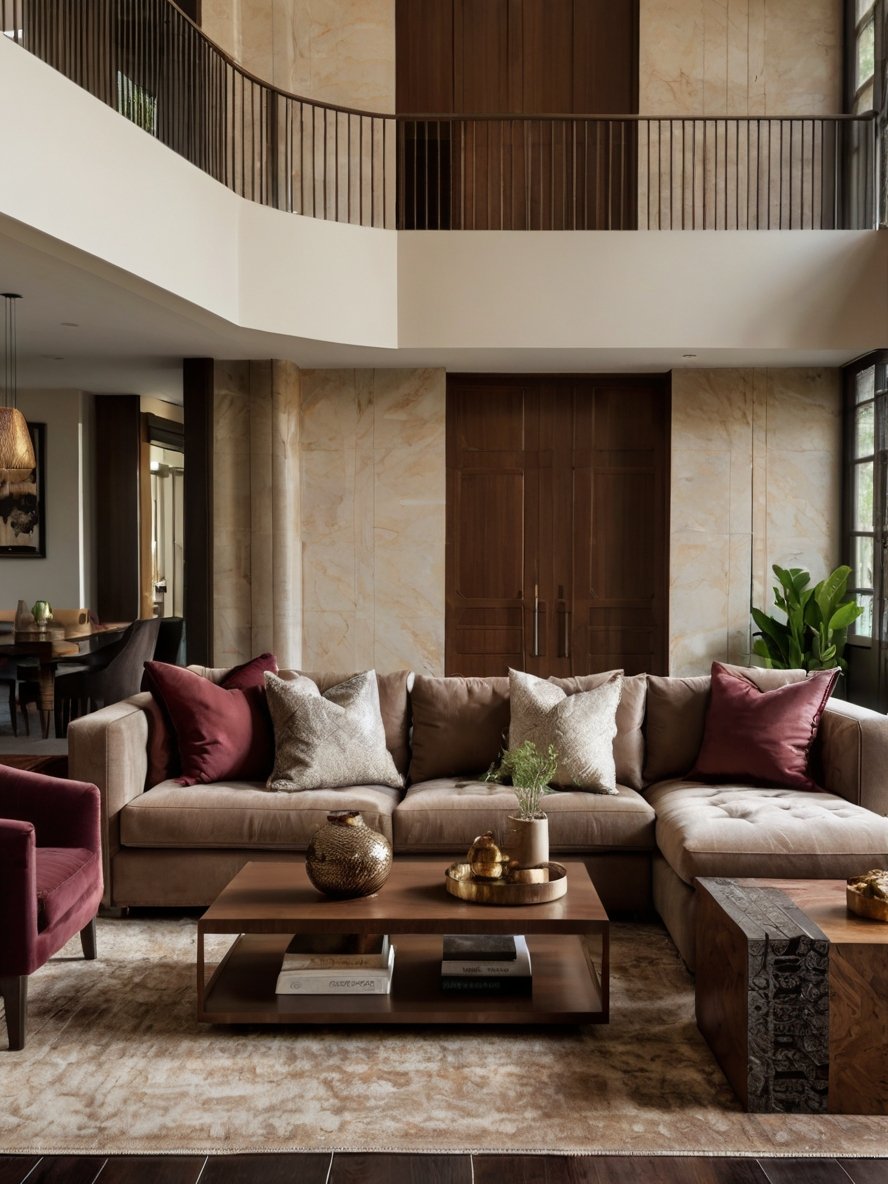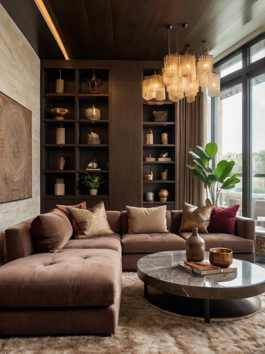 The luxurious velvet sectional in a rich cocoa brown tone is the epitome of comfort and style. Its deep seating and tufted upholstery invite relaxation while maintaining an elegant aesthetic. The L-shape configuration provides ample seating, making the space ideal for both intimate gatherings and larger social occasions. The use of coordinating throw pillows in gold, beige, and burgundy adds layers of texture and warmth. This sectional serves as the anchor of the living room, offering both function and refined design.