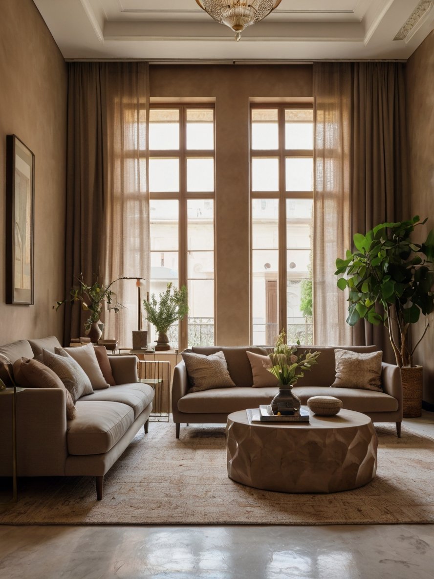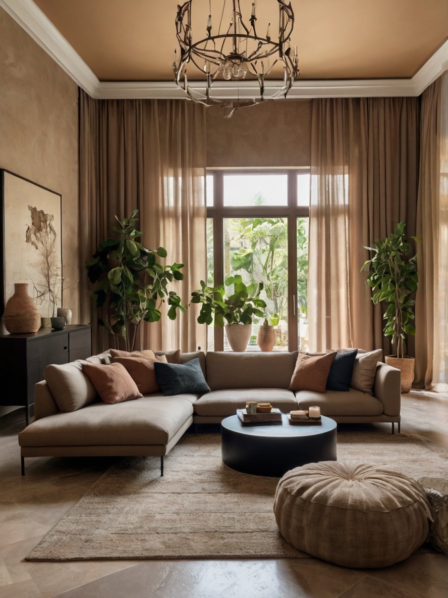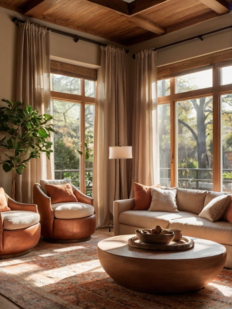 The choice of neutral, lightweight curtains ensures that they blend seamlessly into the design while adding an element of movement and texture. Their subtle draping enhances the room’s elegant aesthetic, making it feel airy and open. The natural light highlights the earthy tones and textures, enhancing the warmth of the space and making it feel even more inviting.