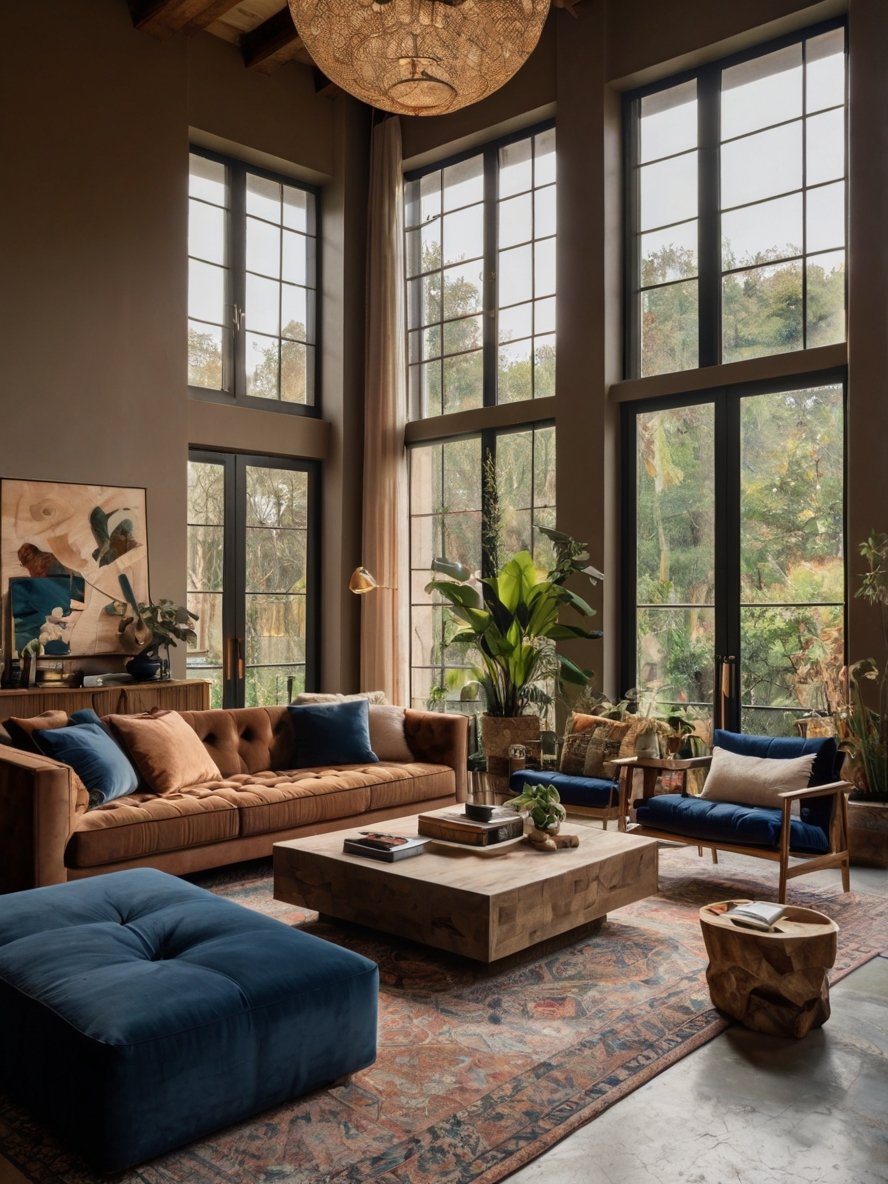 The seating in this living room is perfectly tailored to create a harmonious and inviting space. The large rust-colored sectional sofa serves as the central hub, providing ample room for lounging and bringing a cozy, warm tone to the room. Complementing it are the deep blue velvet armchairs, which not only add a touch of sophistication but also balance the color palette while offering comfortable seating for guests. The oversized ottoman ties the layout together, functioning as a versatile piece for resting feet, extra seating, or even a coffee table. The seating arrangement is strategically designed to encourage conversation, offering a balance between comfort and style, making it ideal for both casual relaxation and social gatherings.
