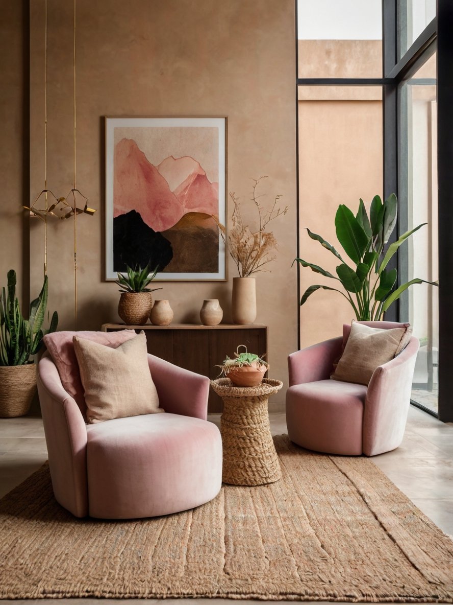 The furniture layout is simple yet highly effective in creating an intimate and comfortable setting. The two plush pink chairs are positioned to encourage conversation, making the space feel sociable and welcoming. Their curved design softens the overall look, preventing any harsh or rigid lines from disrupting the organic flow. The small rattan side table between them serves as a functional and aesthetic anchor, tying the seating arrangement together. This strategic placement ensures that the space remains cozy and functional, making it ideal for unwinding with a cup of coffee or engaging in a relaxed conversation.