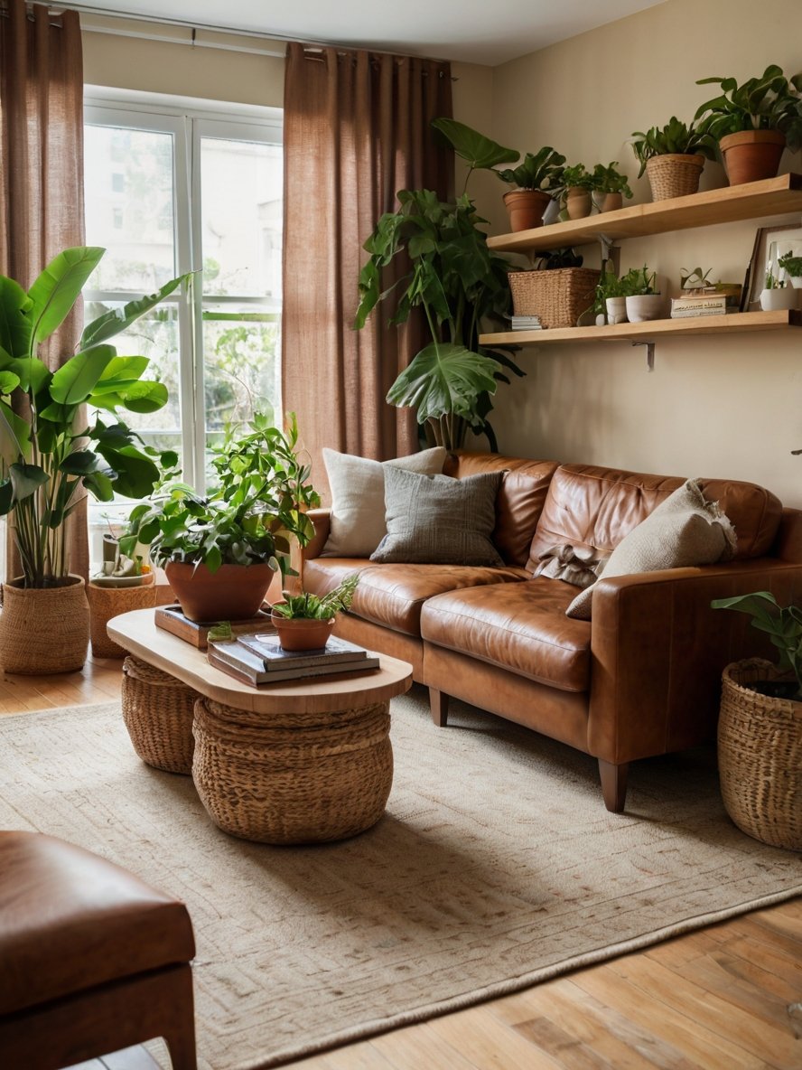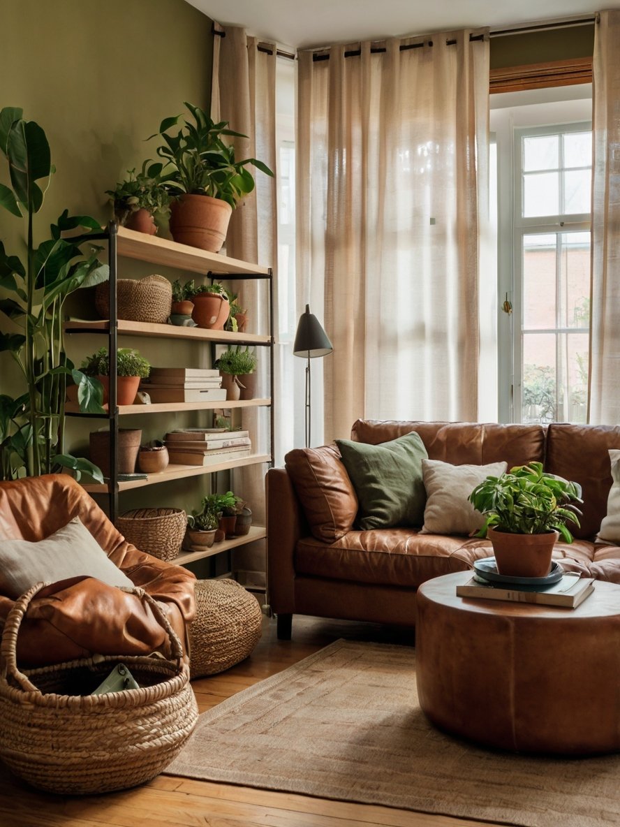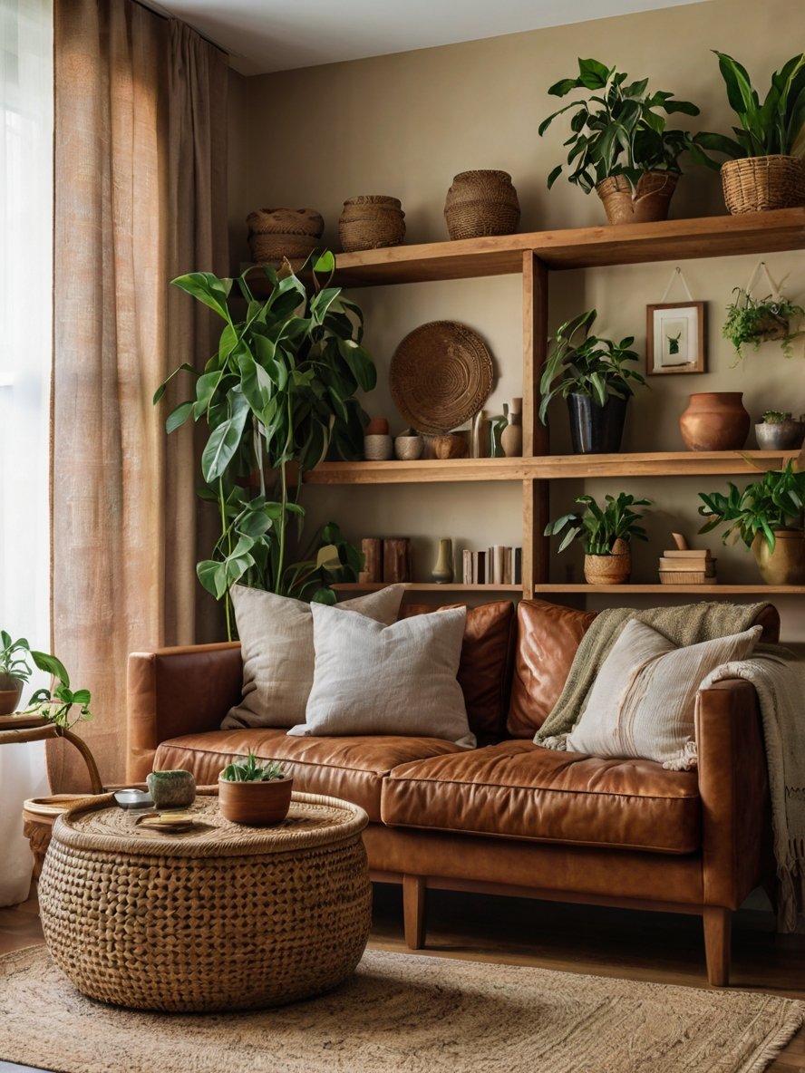 The open shelving unit is a standout feature, serving both aesthetic and functional purposes. Made of wood and metal, it provides a sturdy yet stylish display for an assortment of potted plants, woven baskets, and decorative objects. The staggered arrangement of plants adds movement and depth, preventing the shelves from looking static or cluttered. The inclusion of books and neutral-toned decor items keeps the shelves visually balanced. This shelving solution not only enhances the earthy aesthetic but also introduces practical storage space, making the room feel organized and purposeful.