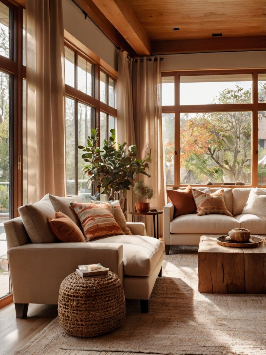 One of the most captivating aspects of this living room is the abundant natural light streaming through the large, grid-framed windows. The windows are framed with floor-length, sheer taupe curtains, which diffuse the sunlight beautifully, creating a soft, ethereal glow throughout the space.