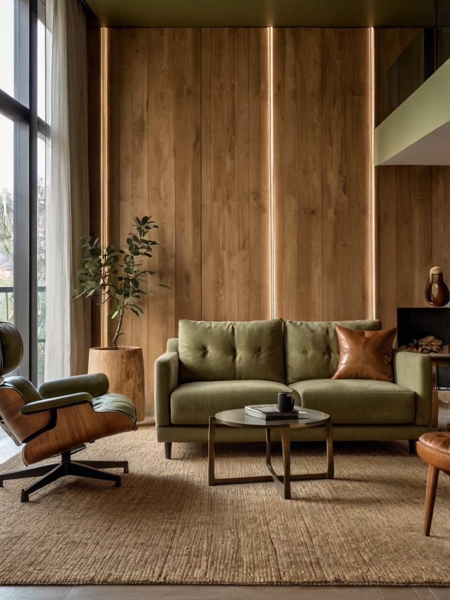 The architecture of this living room plays a crucial role in defining its sophisticated character. The combination of high ceilings, vertical wood panels, and strategic lighting creates a refined yet inviting atmosphere. The dark metal railing visible on the upper level introduces an industrial-modern element, subtly contrasting with the warm organic materials below. The ceiling’s olive tone, echoing the sofa, creates a cohesive look that brings the design full circle. These architectural details ensure that the space feels polished and well-curated, enhancing its overall aesthetic appeal.