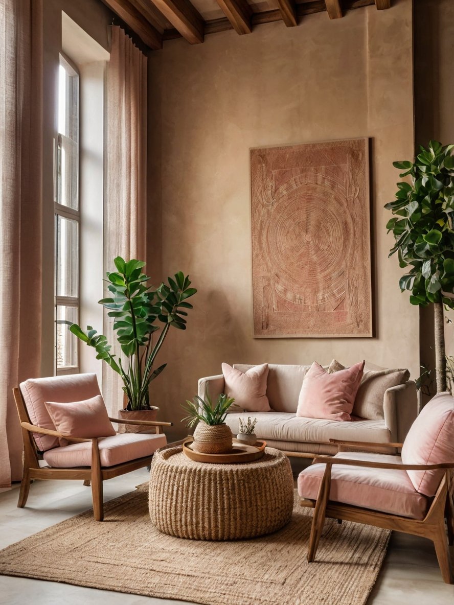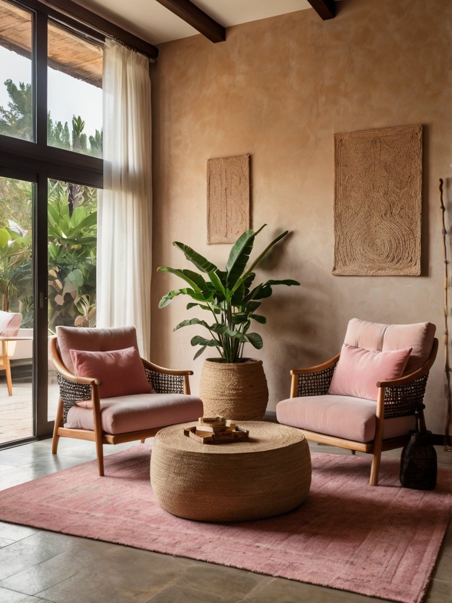 The use of diverse textures in this space adds depth and visual interest. The stucco-finished walls provide a rustic, handcrafted touch, while the woven elements (seen in the chairs, coffee table, and wall art) enhance the organic aesthetic. The plush fabric of the pink cushions contrasts beautifully with the rougher, woven surfaces, striking a balance between softness and structure. The combination of stone flooring, natural fiber textiles, and wood ensures that the room feels tactile and visually engaging. This layered approach to texture makes the space feel curated and cozy, demonstrating the power of mixing materials to create a well-balanced interior.