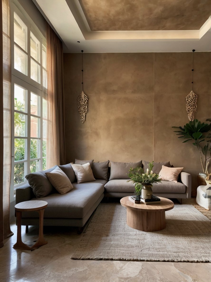 The color palette of this living room is a perfect representation of modern earthy tones. The blend of beige, taupe, and soft gray creates a calming and balanced atmosphere. The natural stucco-finished walls add an organic depth, giving the space a handcrafted and textured feel. The muted tones of the sofa, rug, and furniture contribute to the understated elegance, ensuring the space feels cohesive and well-curated. The choice of these neutral shades not only enhances the aesthetic appeal but also makes the room feel warm and inviting, ideal for relaxation.