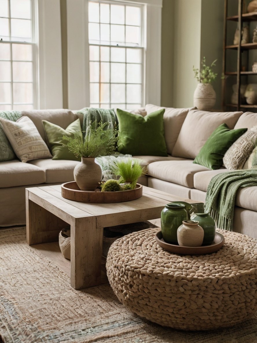 The foundation of this living room’s design lies in its soft, neutral, and earthy color palette. Shades of warm beige, muted taupe, and deep olive green dominate the space, creating a natural, calming atmosphere. The off-white sectional provides a light and airy base, while the various green hues in the throw pillows and blankets introduce a fresh and organic contrast. The wooden elements, from the coffee table to the built-in shelving, reinforce the earthy aesthetic by adding a warm, grounding effect.