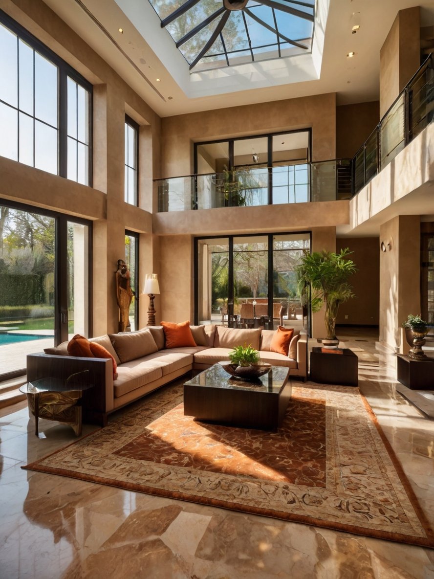 A standout feature of this space is the magnificent skylight, which floods the living room with natural daylight. Positioned at the center of the ceiling, the glass panels allow sunlight to stream in, creating dynamic lighting effects throughout the day. The black framing of the skylight adds a contemporary contrast to the warm beige walls, subtly enhancing the room’s structure. The presence of natural light eliminates the need for excessive artificial lighting during the day, promoting energy efficiency while highlighting the earthy color scheme. This feature also enhances the connection to nature, making the living space feel bright, open, and in harmony with the outdoor environment.