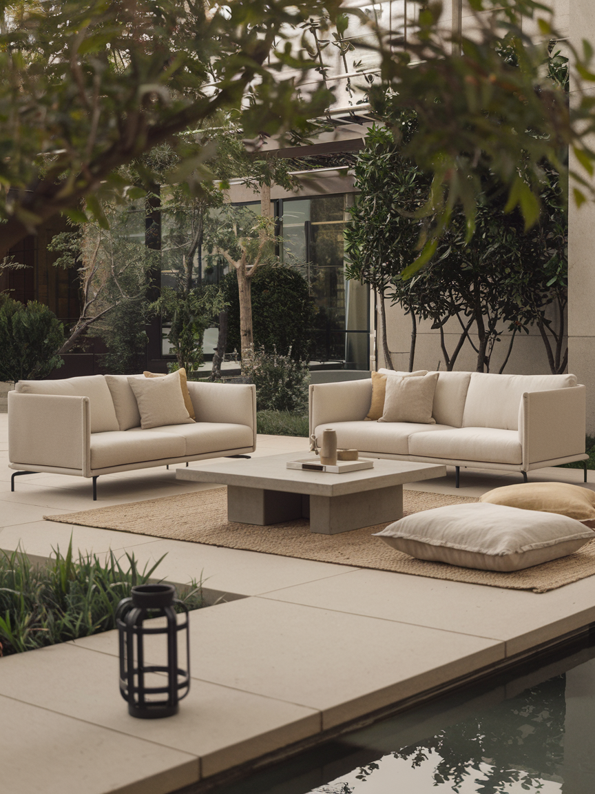 A minimalist patio lounge creates instant elegance through simplicity. Choose streamlined outdoor sofas with low profiles, upholstered in neutral tones like beige, taupe, or soft gray. Pair them with a sleek concrete or stone coffee table to maintain a clean aesthetic. The key to this look is restraint—avoid overcrowding the space with too many decorative elements. Instead, focus on high-quality materials and subtle textures such as linen cushions, woven rugs, and matte black lanterns. Neutral palettes allow the natural greenery around your patio to stand out while creating a serene and sophisticated atmosphere. This design works especially well in modern homes where the patio seamlessly flows from an indoor living area, reinforcing a calm and cohesive visual story.