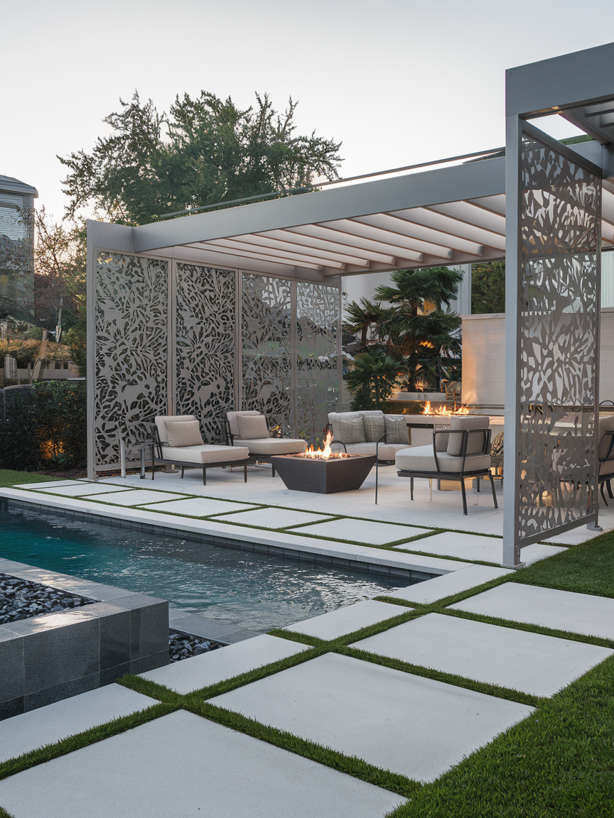 Modern privacy screens provide seclusion while enhancing the patio’s architectural appeal. Laser-cut metal panels, vertical wood slats, or frosted glass partitions maintain airflow and natural light while adding clean lines and texture. Coordinating finishes with furniture or pergolas ensures visual harmony. Climbing greenery can soften the structure for a balanced look, while strategic lighting creates elegant shadow effects at night. Rather than feeling like a barrier, a well-designed privacy screen becomes a stylish feature that strengthens the patio’s refined and contemporary aesthetic.