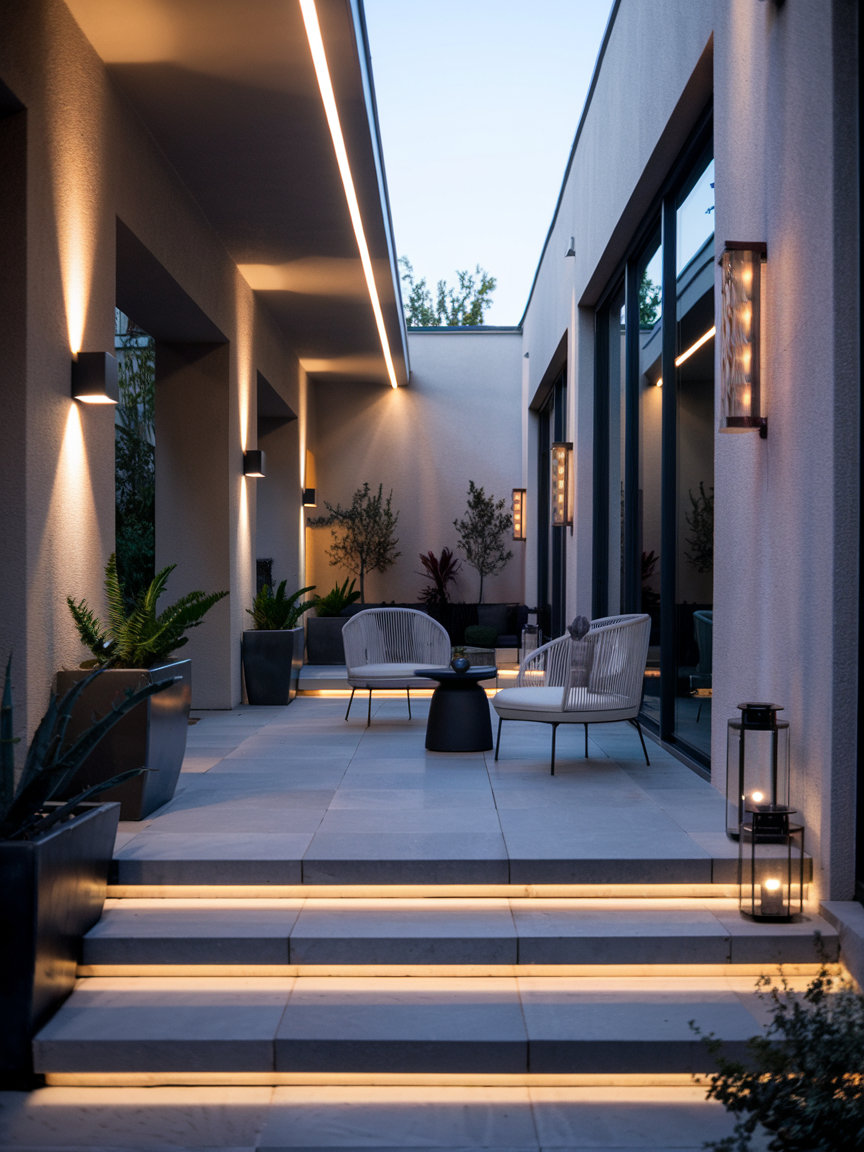Lighting plays a transformative role in modern patio design, especially after sunset. Instead of relying on a single overhead fixture, incorporate layered lighting to create depth and atmosphere. Combine recessed floor lights, wall sconces, lanterns, pendant lights, and subtle LED strips along steps or seating edges. Warm-toned lighting enhances comfort while preserving an elegant ambiance. Strategic placement highlights architectural features like textured walls, pergolas, or planters. Dimmable options allow you to shift from lively entertaining to intimate relaxation effortlessly. Layered lighting not only improves safety but also adds a luxurious glow that elevates the entire patio. The key is balance—avoid overly bright or cool lighting that disrupts the refined mood. When thoughtfully designed, your patio becomes just as inviting at night as it is during the day.