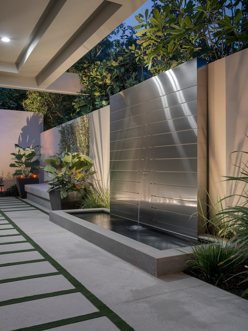 Adding a sleek water feature introduces movement and sound, enhancing the sensory experience of your patio. Modern designs often feature minimalist fountains, narrow reflecting pools, or vertical water walls with clean lines. The gentle sound of flowing water creates a calming atmosphere, masking background noise and adding serenity. Choose materials like concrete, stone, or matte metal to maintain a contemporary aesthetic. Integrating soft lighting around the water element further elevates its elegance at night. This feature works beautifully in both small and expansive patios, serving as either a subtle accent or a dramatic focal point. Beyond aesthetics, the tranquil ambiance enhances relaxation, making your patio feel like a private retreat designed for peaceful outdoor living.