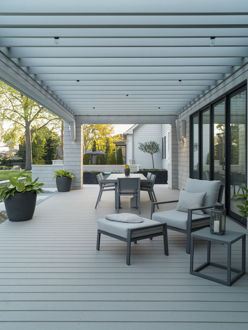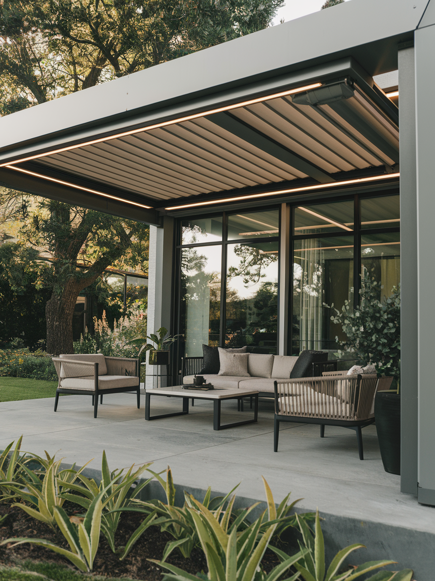 A retractable roof offers flexibility and luxury in equal measure. This feature allows you to adjust shade and sunlight according to weather conditions. Choose a sleek motorized system with a minimalist design to preserve the modern aesthetic. The ability to open the roof fully enhances ventilation and openness, while closing it provides shelter from rain or intense sun. This adaptability extends patio usability throughout the year. Pair the structure with subtle lighting and streamlined furniture to maintain elegance. A retractable roof makes your outdoor space more versatile without sacrificing style, ensuring comfort and sophistication regardless of the season.