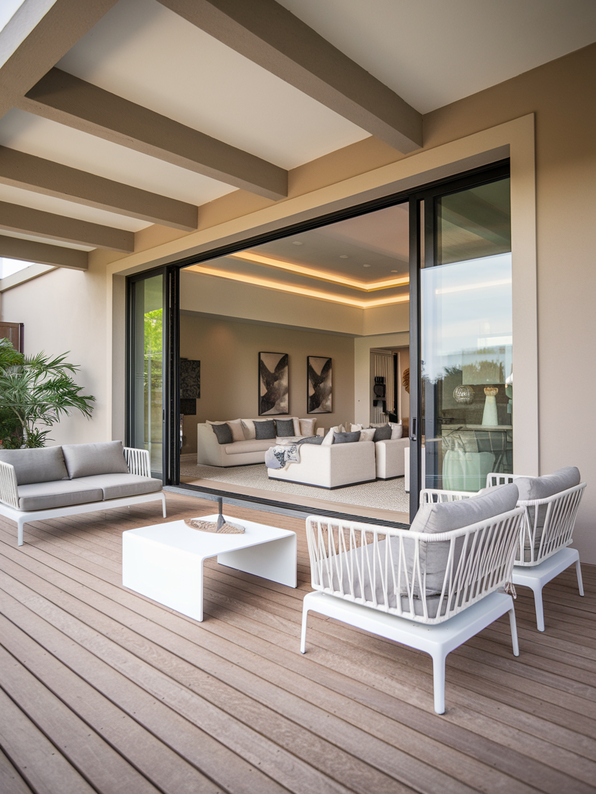 To truly redefine outdoor living, blur the line between interior and exterior spaces. Floor-to-ceiling sliding glass doors create a seamless transition from your living room to the patio. When opened, they expand your entertaining space and invite natural light indoors. Choose slim black frames for a contemporary edge or frameless options for maximum transparency. Matching indoor and outdoor flooring enhances visual continuity, making the patio feel like an extension of your home. This architectural feature elevates both functionality and design. It allows the patio to feel integrated rather than separate, reinforcing a cohesive modern aesthetic. The openness creates a bright, airy environment that enhances comfort and elegance year-round.
