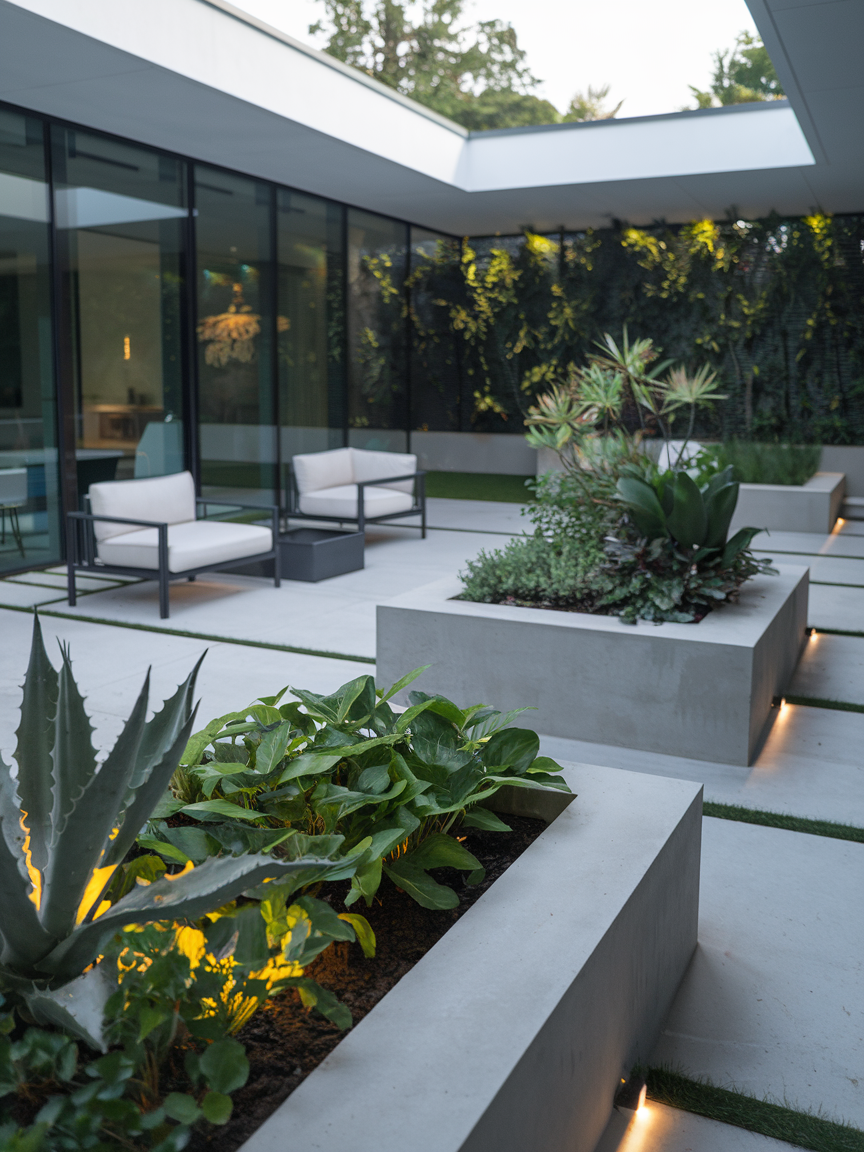 Structured greenery enhances modern patios without overwhelming the design. Raised planter boxes built from concrete, metal, or wood offer a clean and organized way to incorporate plants. Choose architectural plants such as ornamental grasses, olive trees, or sculpted shrubs to complement the sleek setting. The defined edges of planter boxes add structure and help frame the patio layout. This method keeps landscaping intentional and tidy, aligning with minimalist principles. Integrated lighting inside the planters can highlight foliage at night, adding subtle drama. Raised planters also improve accessibility and maintenance. By combining greenery with clean geometry, you achieve a balanced outdoor space that feels both lively and refined.