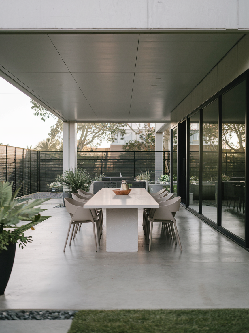 An elegant dining setup transforms your patio into a refined gathering space. Choose a streamlined dining table in wood, concrete, or metal with minimalist chairs for a contemporary feel. Keep table decor simple—linen runners, ceramic dishware, and subtle centerpieces like greenery or candles. Overhead lighting, such as a statement pendant or discreet string lights, adds warmth without overpowering the design. Position the dining area strategically to allow comfortable circulation and scenic views. Neutral cushions and subtle textures enhance comfort while maintaining sophistication. This setup creates an inviting atmosphere for everything from casual brunches to formal evening dinners. With thoughtful styling, your patio dining area becomes a natural extension of your home’s elegance.