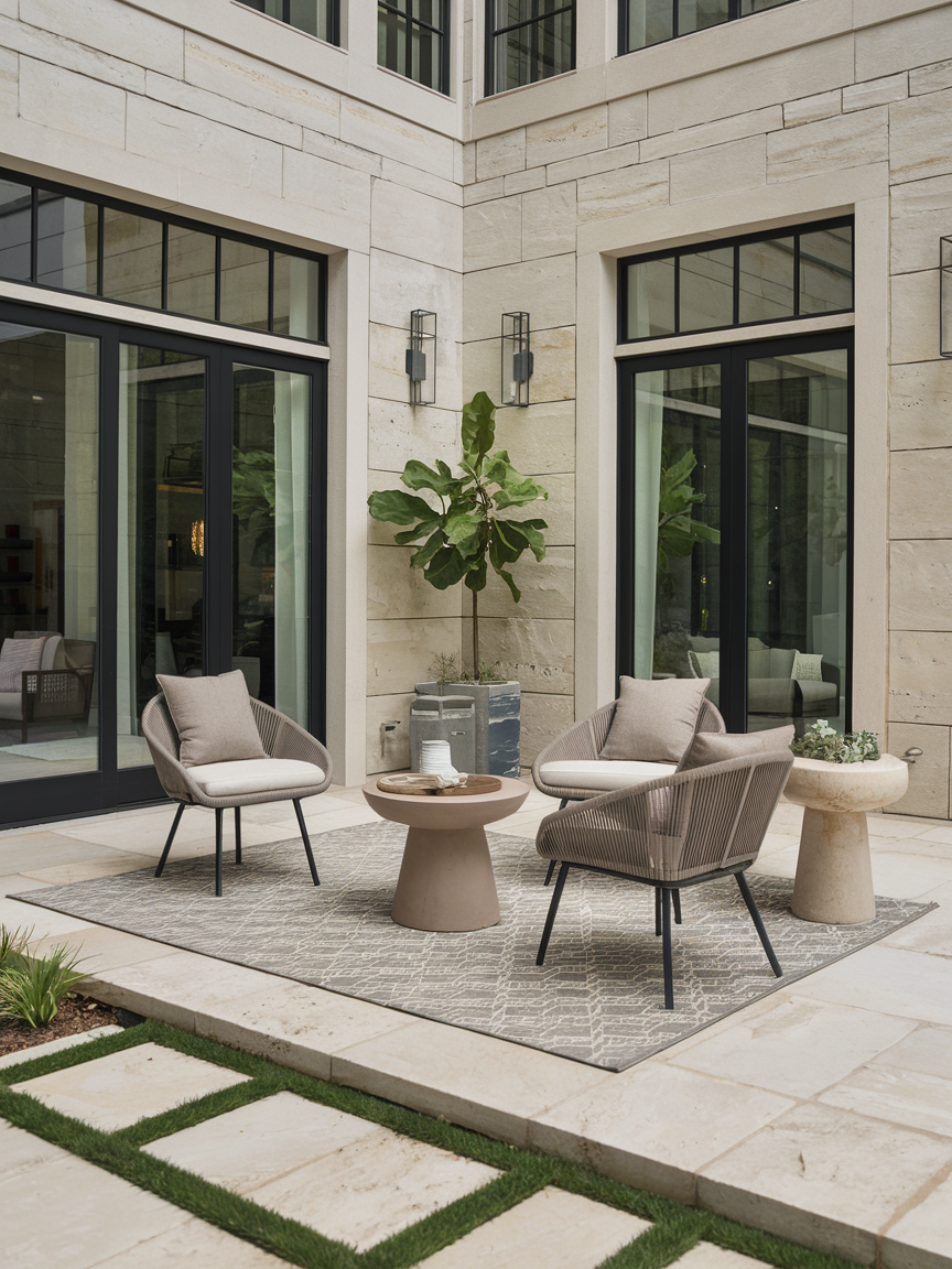 An outdoor rug grounds your seating area and introduces warmth. Choose a durable, weather-resistant material in neutral or subtly patterned tones. The rug visually defines the lounge zone, making the patio feel intentional and complete. Textured rugs soften hard surfaces like stone or concrete, enhancing comfort underfoot. Opt for simple geometric patterns or understated stripes that align with modern aesthetics. The added layer creates depth and cohesion within the layout. When paired with matching cushions and throw pillows, the rug ties the entire design together. This small addition significantly elevates the overall look, making the patio feel like a fully furnished outdoor living room.