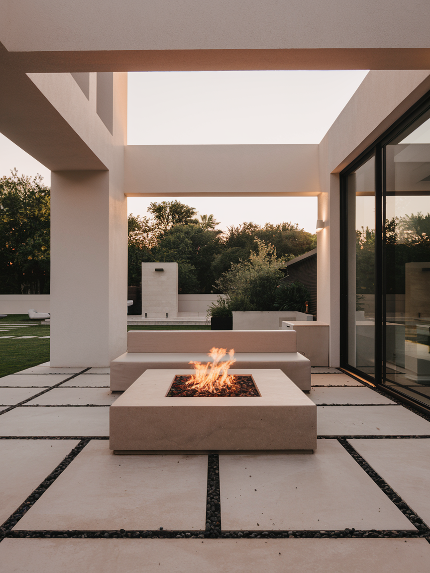 A modern fire pit serves as both a functional and visual centerpiece. Choose a linear gas fire pit or a round concrete design with clean edges. Surround it with low-profile seating arranged symmetrically for balance. The warmth extends patio use into cooler evenings while enhancing ambiance. Keep the surrounding decor minimal to allow the fire feature to stand out. Integrated seating or built-in benches add sophistication and save space. The glow of flames against neutral finishes creates a striking contrast that feels luxurious yet inviting. A well-designed fire pit transforms the patio into a welcoming gathering space that encourages conversation and relaxation.