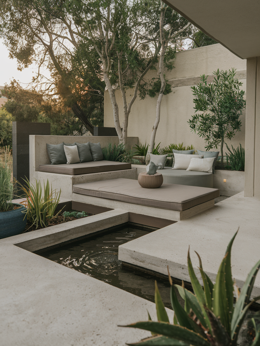 Built-in seating instantly elevates a patio’s design by giving it a custom architectural feel. Concrete benches integrated into retaining walls or perimeter edges create a sleek, modern silhouette. To soften the look, add plush outdoor cushions in weather-resistant fabrics and layer with textured throw pillows. Built-in seating maximizes space efficiency and eliminates the need for bulky furniture, making it ideal for smaller patios. The clean lines of concrete contrast beautifully with natural wood accents or greenery, offering a balanced aesthetic. This idea also provides durability and low maintenance, making it practical as well as stylish. When paired with subtle LED strip lighting underneath the seating, the patio transforms into a refined evening retreat that feels both contemporary and inviting.