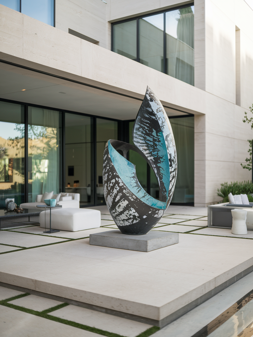 Outdoor art adds personality and sophistication to your patio. Choose weather-resistant sculptures, metal wall art, or abstract installations that complement the modern aesthetic. Keep the surrounding decor minimal to let the artwork stand out. Art introduces character and makes the space feel curated rather than purely functional. Large-scale pieces work well against blank walls, while smaller sculptures can accent seating areas. The right artwork transforms your patio into an expressive extension of your interior style. This approach reinforces elegance through thoughtful detail.
