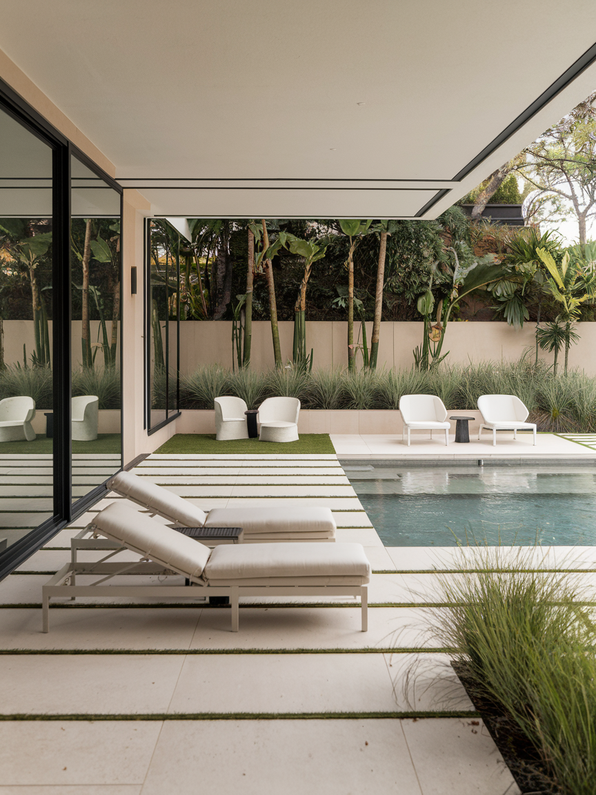 A sleek poolside patio emphasizes clean lines and luxury. Use large-format tiles, minimalist loungers, and subtle landscaping. Keep colors neutral to maintain cohesion. Glass fencing enhances openness while ensuring safety. Integrate subtle lighting to reflect off the water at night. The simplicity of design allows the pool to shine as the focal point. A poolside patio designed with elegance feels like a private resort, redefining outdoor living with relaxation and sophistication.