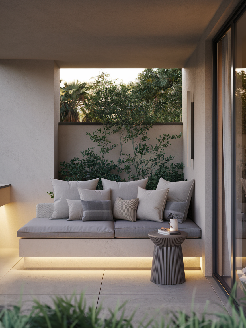 Even small patios can feel luxurious with a cozy corner nook. Use a compact sectional or built-in bench with plush cushions. Add a small side table and subtle lighting for ambiance. Position the nook near greenery or a privacy screen for intimacy. Neutral tones maintain elegance while soft textiles add comfort. This small yet intentional setup creates a peaceful retreat perfect for morning coffee or evening relaxation.