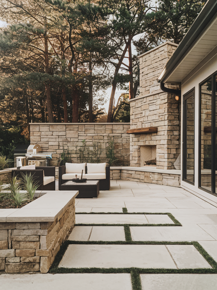 Combining concrete pavers with strips of grass creates a striking geometric pattern. This design balances hard and soft elements for a contemporary look. The clean lines of concrete contrast beautifully with vibrant greenery, creating visual rhythm. This layout works well for walkways or patio flooring. It adds texture and dimension without overwhelming the space. The result feels structured yet natural, aligning perfectly with modern landscaping trends. Proper spacing ensures easy maintenance and durability. This combination redefines outdoor living by blending architectural precision with organic charm.