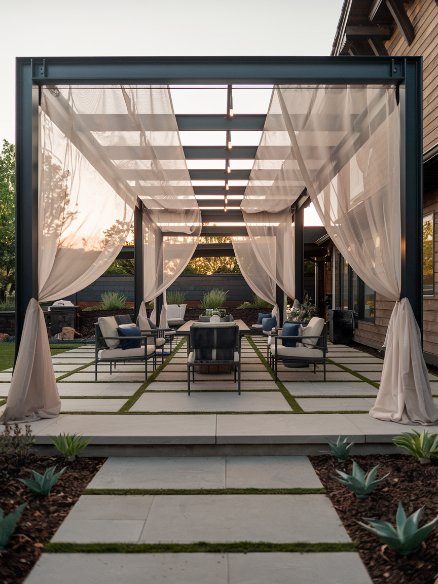 A pergola adds architectural structure while maintaining openness. For an elegant modern twist, choose a black metal or natural wood pergola with clean, straight lines. Enhance the atmosphere with flowing sheer drapes that gently move in the breeze. These soft textiles introduce a romantic element while still keeping the overall look contemporary. Sheer curtains also provide partial shade and privacy, making the patio feel intimate and resort-inspired. Add warm lighting, such as string lights or pendant fixtures suspended from the beams, to complete the design. The contrast between the strong pergola frame and delicate drapery creates visual harmony. This setup transforms your patio into a luxurious outdoor lounge perfect for evening dinners, gatherings, or quiet relaxation under the stars.