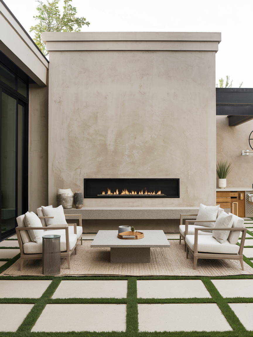 An outdoor fireplace wall instantly becomes the focal point of a modern patio. Opt for sleek materials such as smooth stucco, stacked stone, or large-format porcelain tiles. A linear gas fireplace enhances the contemporary feel while offering warmth and ambiance. Surround the fireplace with built-in shelving or minimalist decor elements for added sophistication. Arrange seating symmetrically around the fireplace to create a balanced and inviting layout. The flickering flames add both visual warmth and physical comfort, extending patio usability into cooler months. This design works beautifully in larger outdoor spaces where you want a defined gathering area. When styled with neutral seating and subtle lighting, the fireplace wall becomes a dramatic yet refined statement piece.
