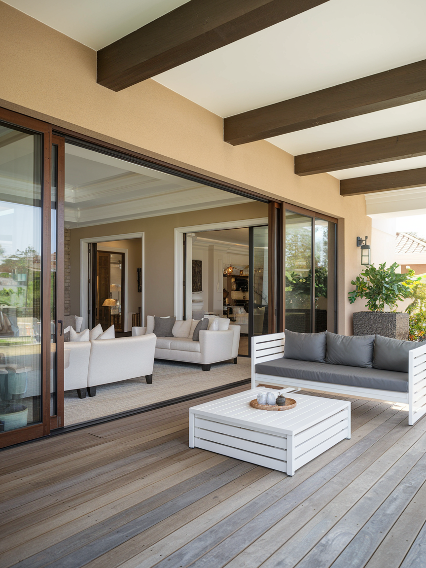 Seamless indoor-outdoor styling creates a unified living experience by mirroring colors, materials, and textures between interior and exterior spaces. Matching flooring tones and coordinating furniture finishes enhance visual flow when doors are open. Neutral palettes, layered cushions, and subtle decor pieces maintain comfort while preserving modern elegance. This cohesive approach makes the patio feel like a natural extension of the home, expanding perceived space and blending indoor comfort with outdoor freshness in a sophisticated and intentional way.