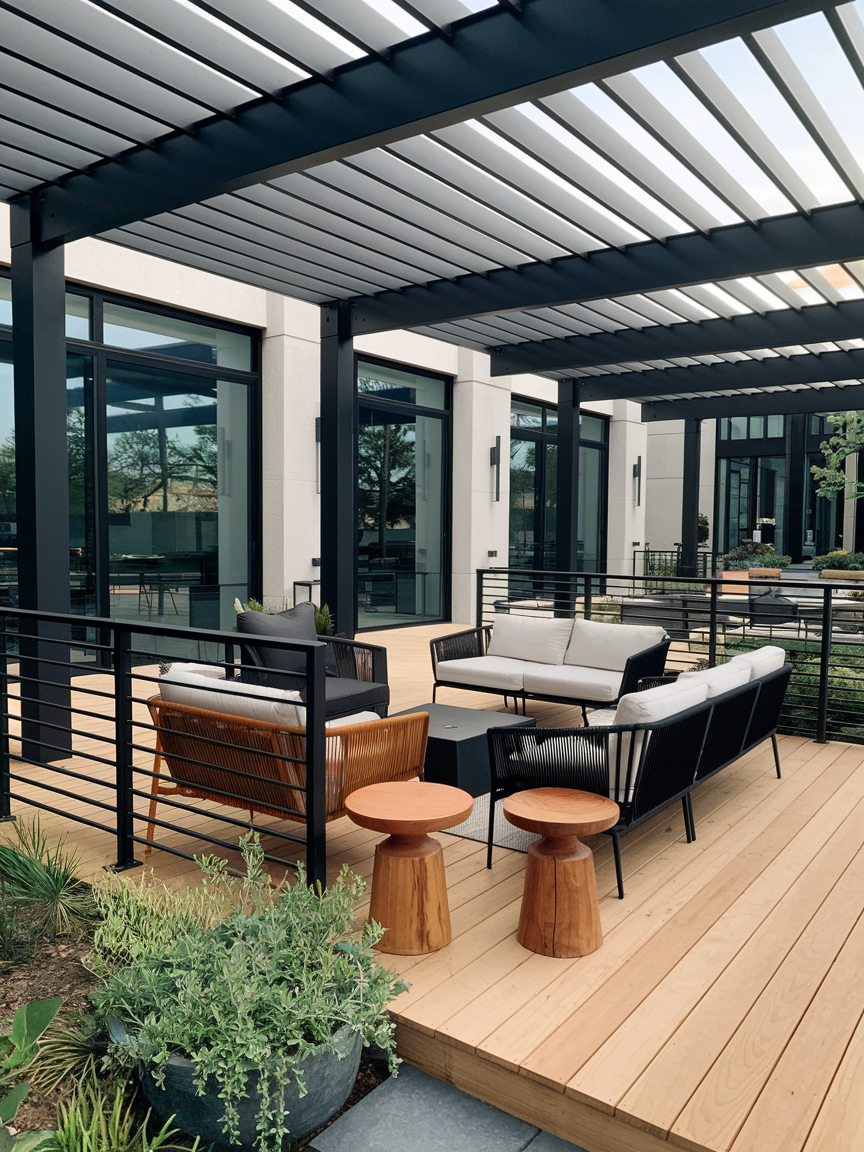 One of the most elegant modern patio combinations is the contrast between matte black finishes and warm natural wood. Use black metal furniture frames, railings, or pergola structures paired with teak or cedar decking and accent tables. This contrast creates a bold yet balanced design that feels current and sophisticated. The richness of wood softens the intensity of black, preventing the space from feeling too stark. Add neutral cushions and subtle greenery to maintain harmony. This color pairing complements modern architecture beautifully, especially homes with large glass doors and clean lines. The result is a patio that feels refined, dramatic, and intentionally designed without appearing overly complicated.